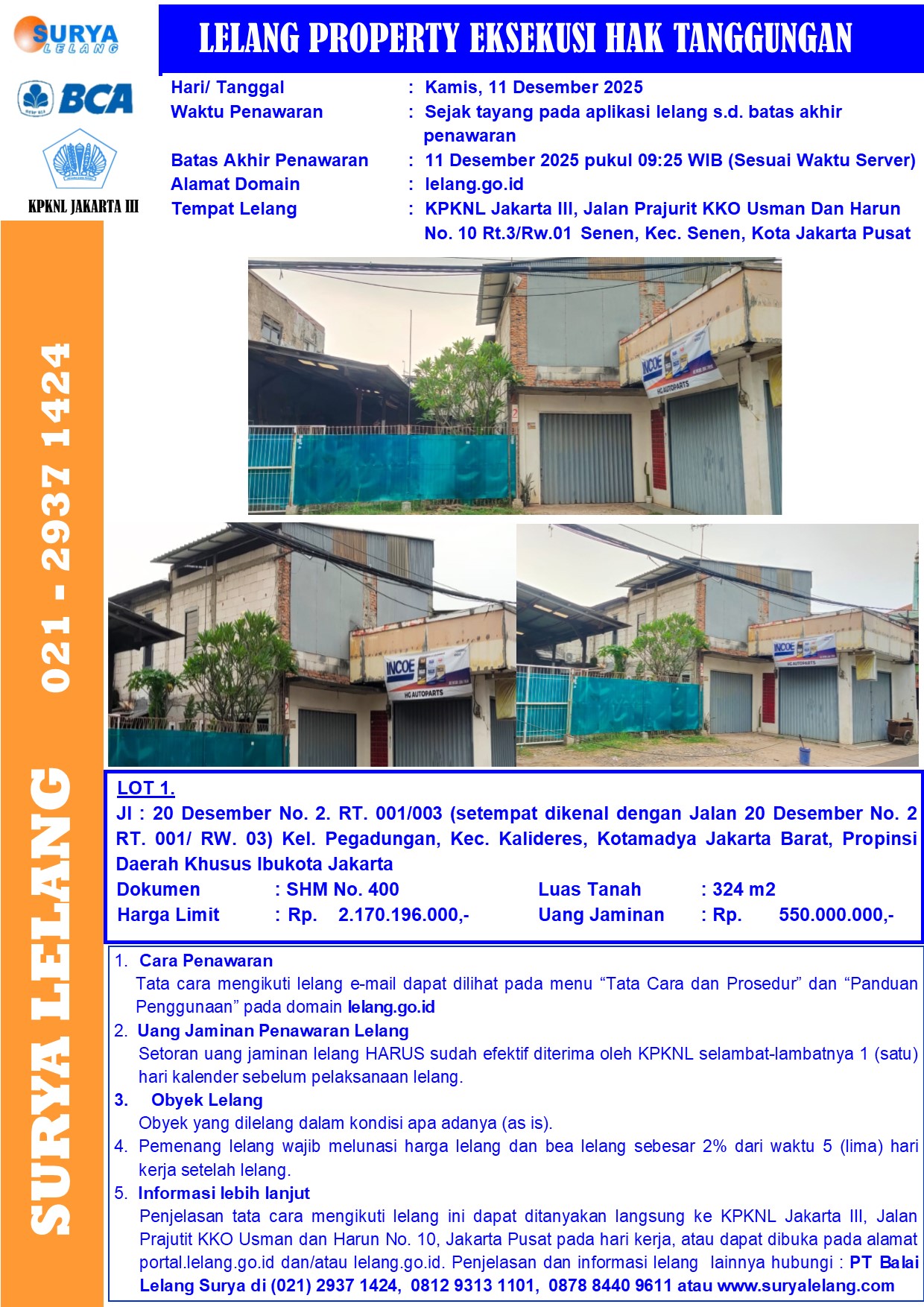 Sebidang tanah seluas 324 m2 berikut bangunan sesuai SHM No. 400 atas nama Mardji Pujowahono, terletak di Jl : 20 Desember No. 2. RT.001/003 (setempat dikenal dengan Jalan 20 Desember No. 2 RT. 001 / RW. 03) Kel. Pegadungan, Kec. Kalideres, Kotamadya Jakarta Barat, Propinsi Daerah Khusus Ibukota Jakarta