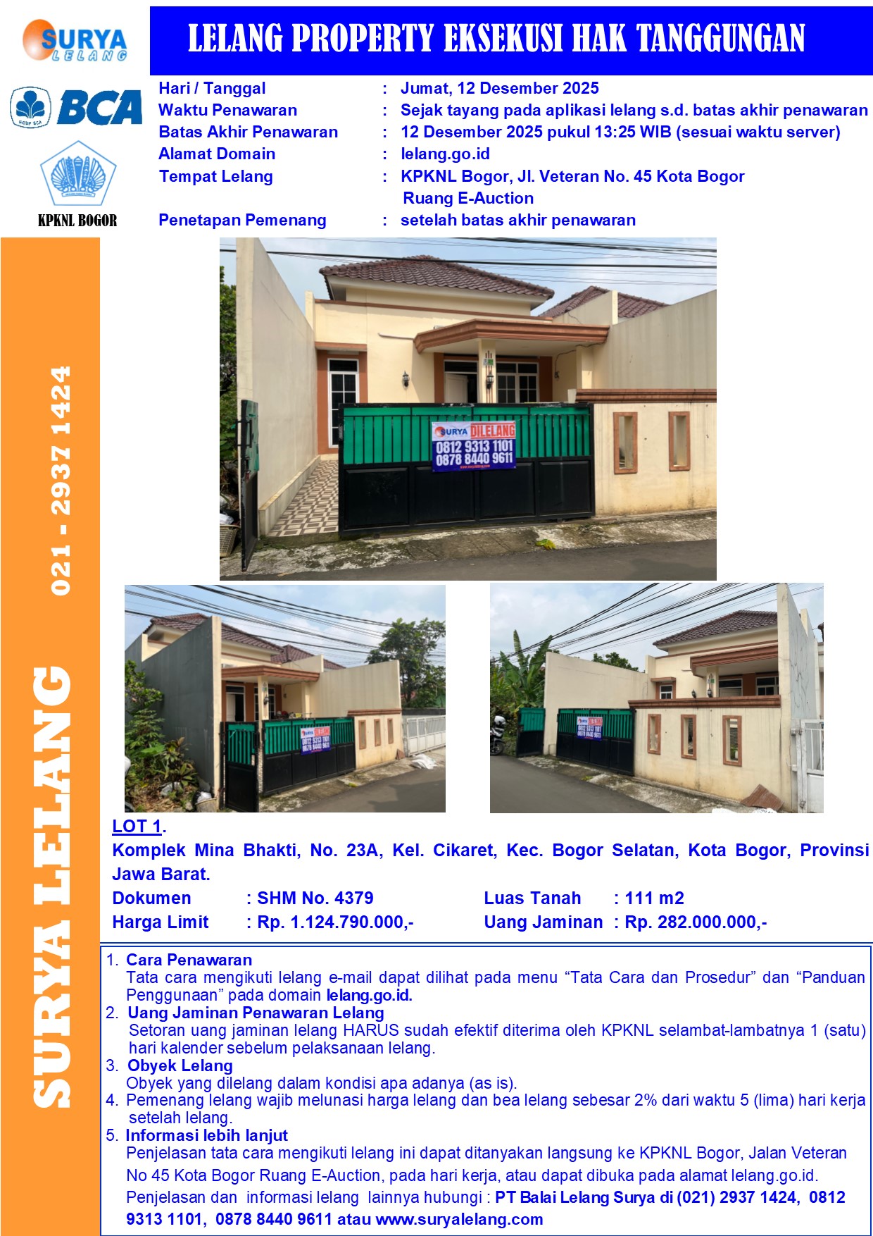 Sebidang tanah seluas 111 m2 berikut bangunan sesuai SHM No. 4379, setempat dikenal dengan Komplek Mina Bhakti, No. 23A, Kel. Cikaret, Kec. Bogor Selatan, Kota Bogor, Provinsi Jawa Barat