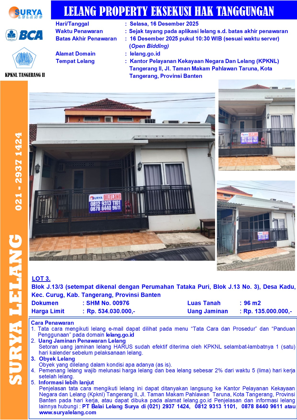 Sebidang tanah seluas 96 m2 berikut bangunan sesuai SHM No. 514/Kadu, terletak di Blok J.13/27, Desa Kadu, Kec. Curug, Kab. Tangerang,