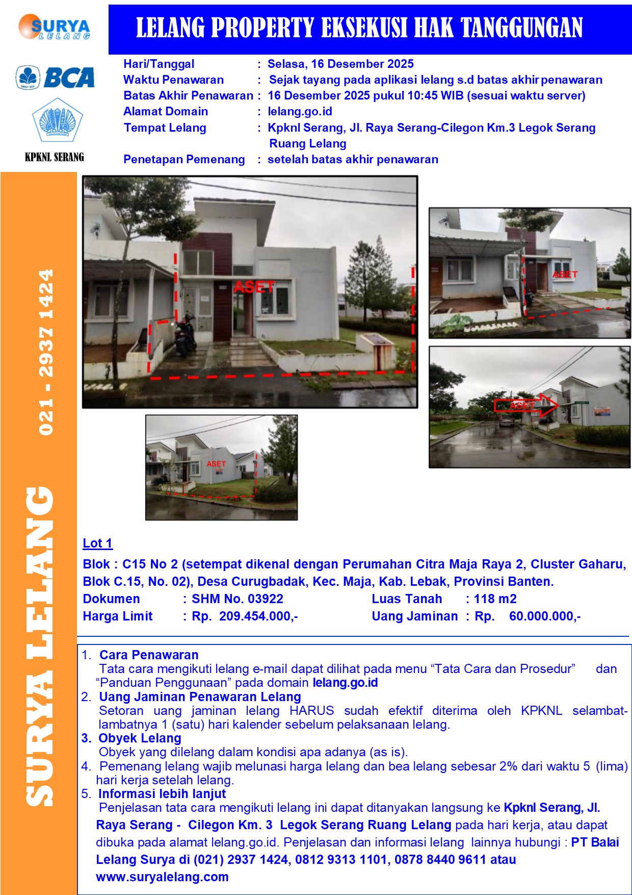 Sebidang tanah seluas 118 m2 berikut bangunan sesuai SHM No. 03922, terletak di Blok : C15 No 2 (setempat dikenal dengan Perumahan Citra Maja Raya 2, Cluster Gaharu, Blok C.15, No. 02), Desa/Kel. Curugbadak, Kec. Maja, Kab/Kota Lebak, Provinsi Banten