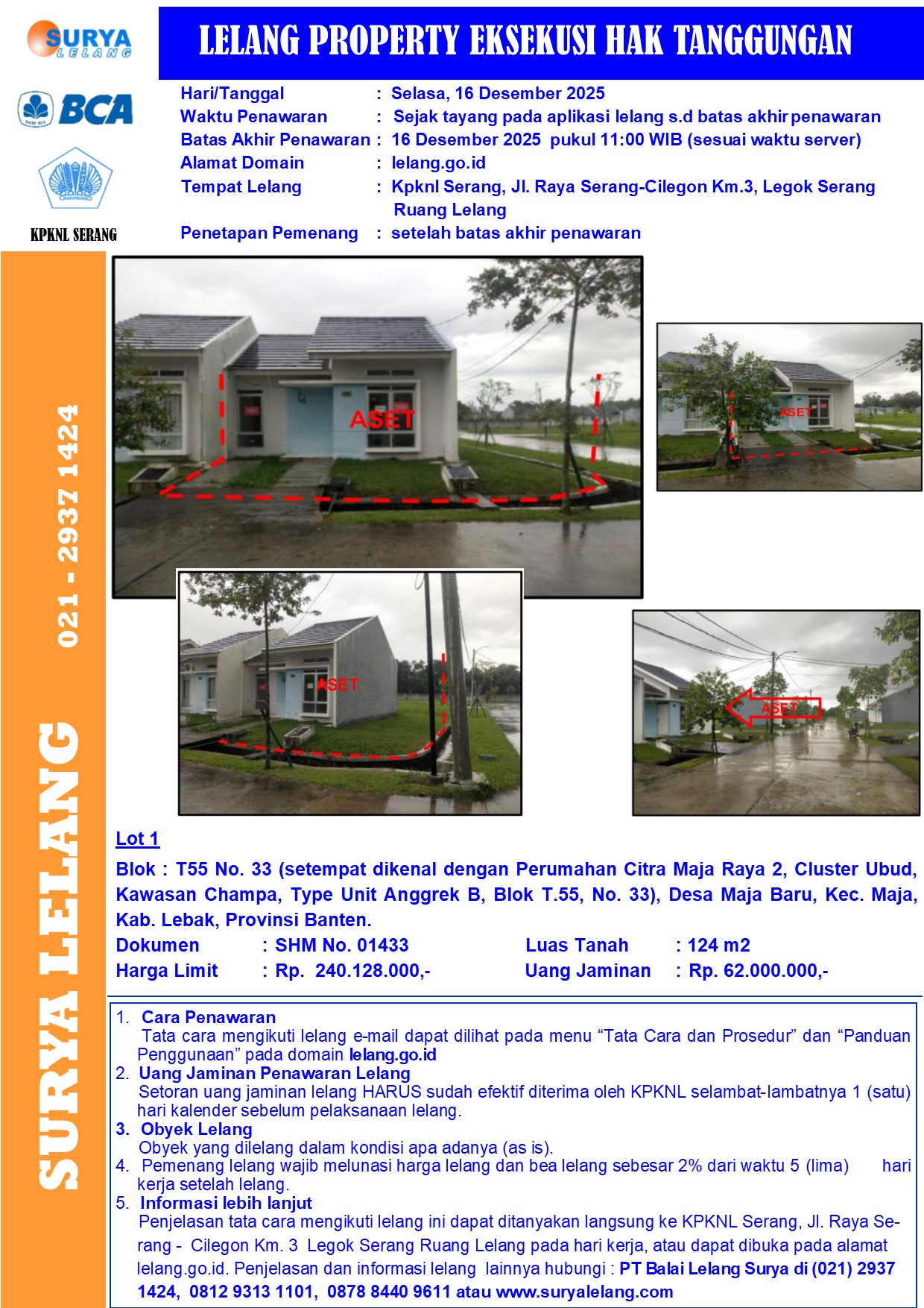 Sebidang tanah seluas 124 m2 berikut bangunan sesuai SHM No. 01433, terletak di Blok : T55 No. 33 (setempat dikenal dengan Perumahan Citra Maja Raya 2, Cluster Ubud, Kawasan Champa, Type Unit Anggrek B, Blok T.55, No. 33), Desa Maja Baru, Kec. Maja, Kab. Lebak, Provinsi Banten