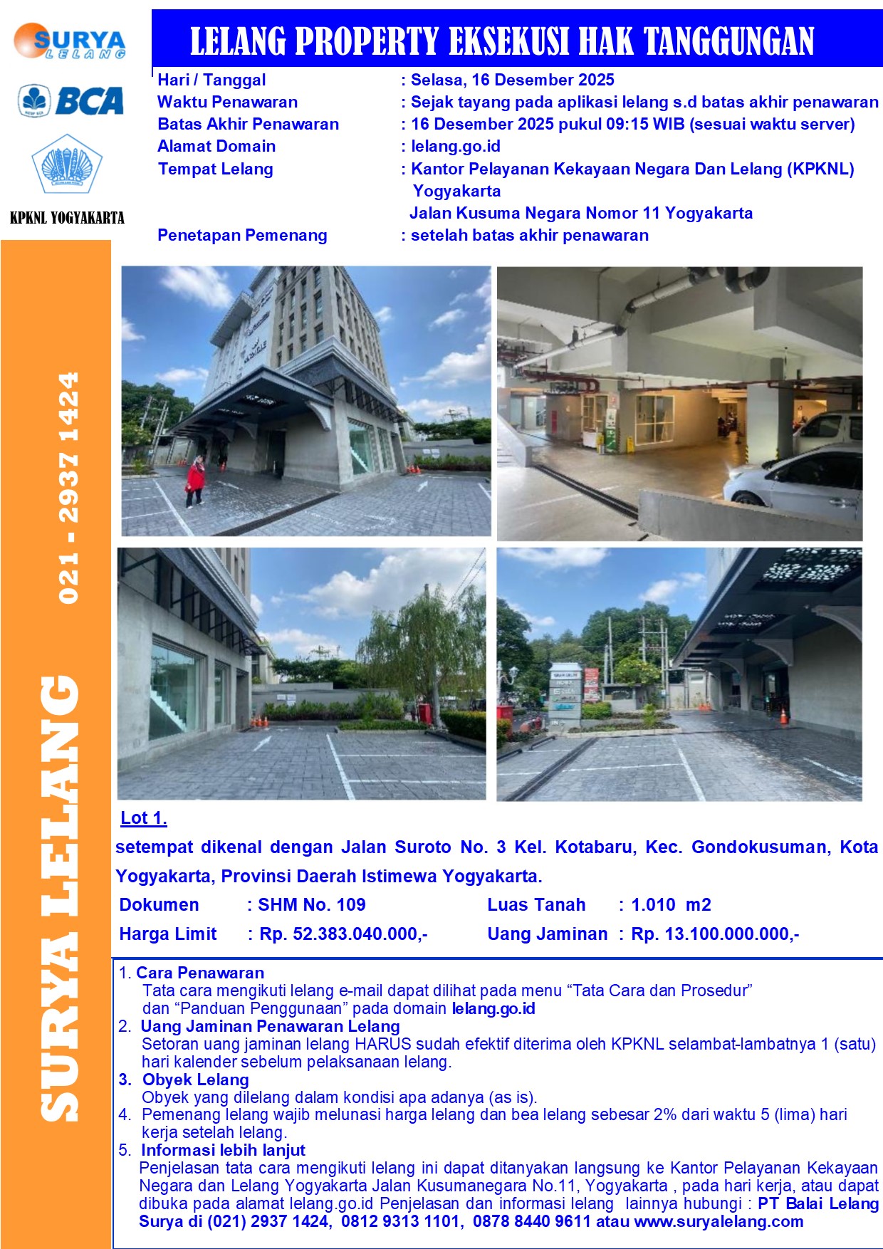 Sebidang tanah seluas 1.010 m2 berikut bangunan sesuai SHM No. 109, setempat dikenal dengan Jalan Suroto No. 3 Kel. Kotabaru, Kec. Gondokusuman, Kota Yogyakarta, Provinsi Daerah Istimewa Yogyakarta