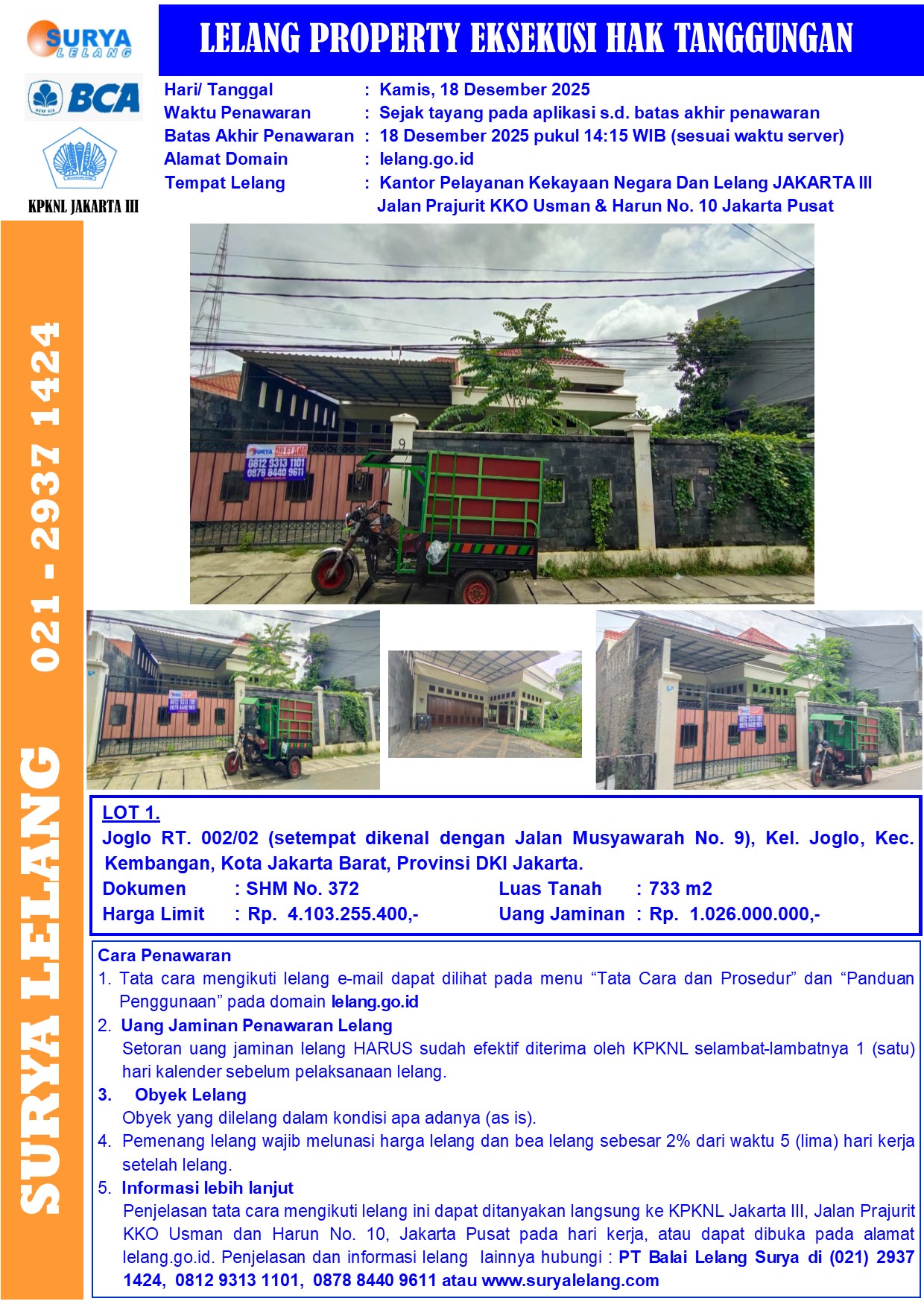 Sebidang tanah seluas 733 m2 berikut bangunan sesuai SHM No. 372, terletak di Joglo RT. 002/02 (setempat dikenal dengan Jalan Musyawarah No. 9), Kel. Joglo, Kec. Kembangan, Kota (dh. Walikota) Jakarta Barat, Propinsi Daerah Khusus Ibukota Jakarta
