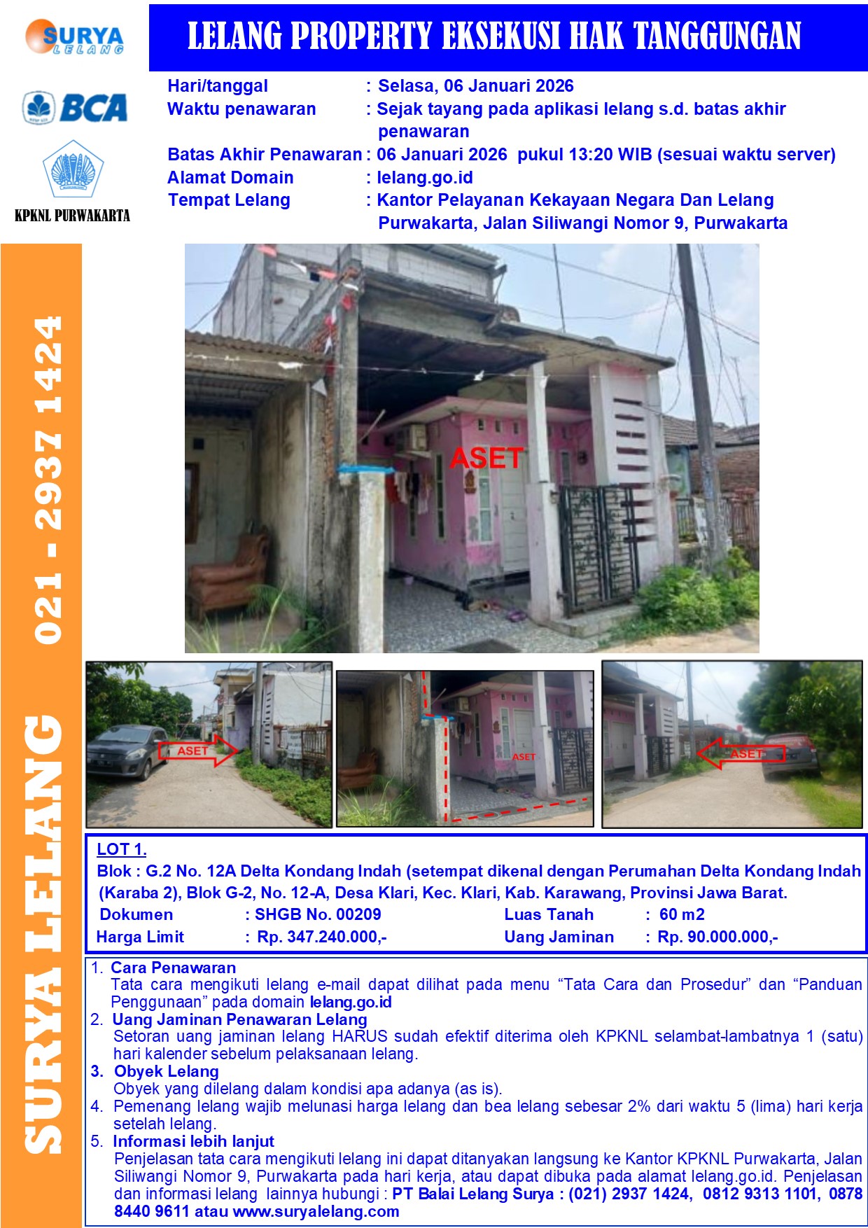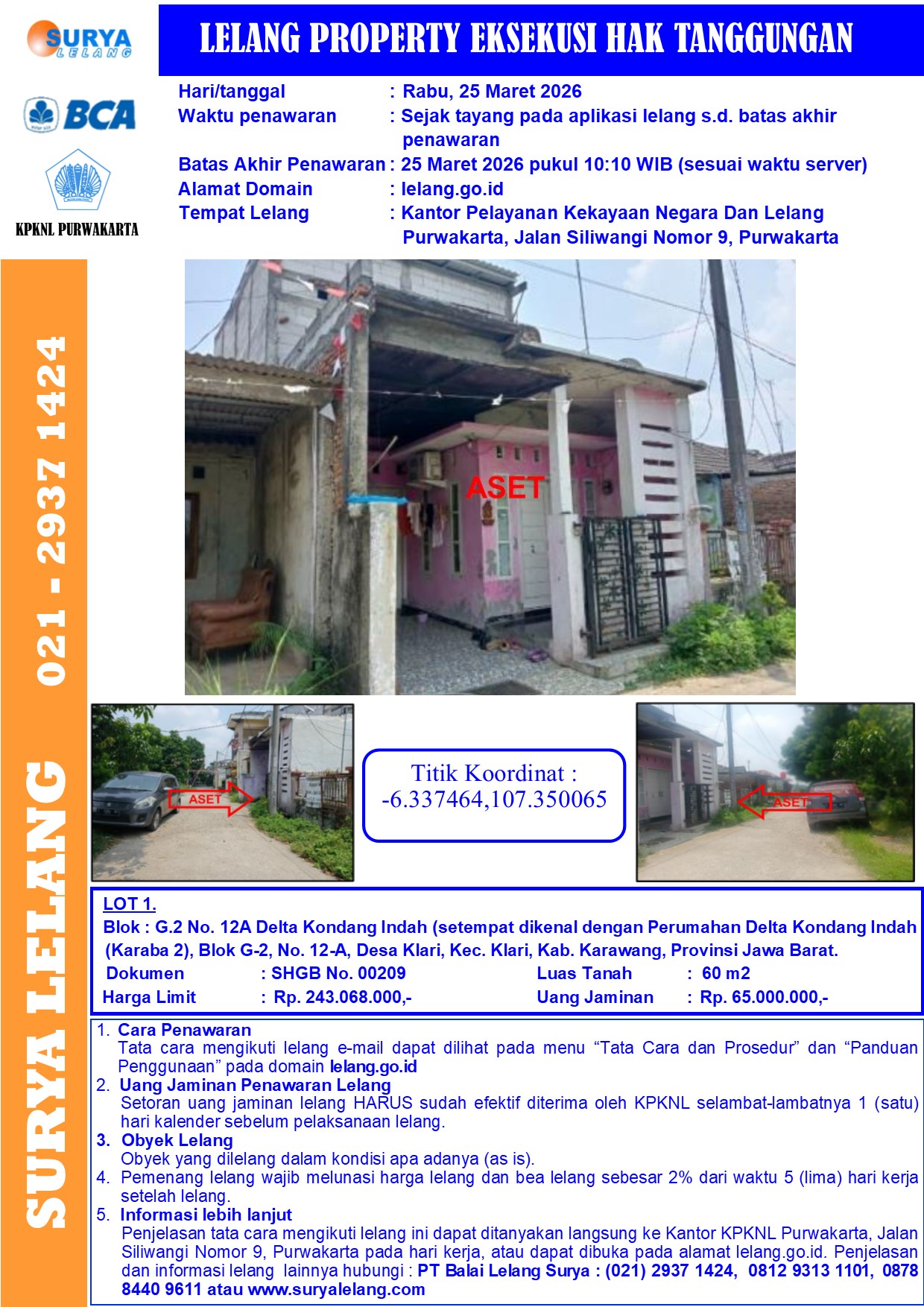Sebidang tanah seluas 60 m2 berikut bangunan sesuai SHGB No. 00209, terletak di Blok : G.2 No. 12A Delta Kondang Indah (setempat dikenal dengan Perumahan Delta Kondang Indah (Karaba 2), Blok G-2, No. 12-A, Desa Klari, Kec. Klari, Kab. Karawang, Propinsi Jawa Barat