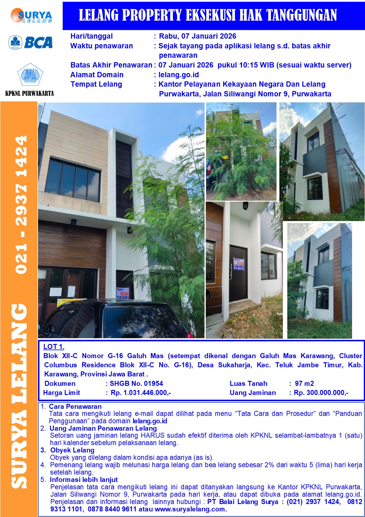 Sebidang tanah seluas 97 m2 berikut bangunan sesuai SHGB No. 01954, terletak di Blok XII-C Nomor G-16 Galuh Mas (setempat dikenal dengan Perumahan Galuh Mas Karawang, Cluster Columbus Residence Blok XII-C No. G-16), Desa Sukaharja, Kec. Teluk Jambe Timur, Kab. Karawang, Provinsi Jawa Barat