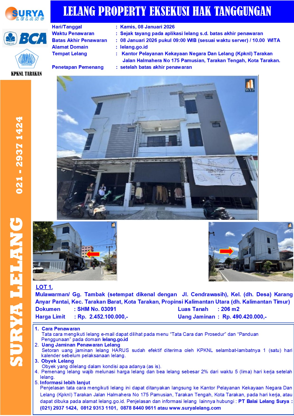 Sebidang tanah seluas 206 m2 berikut bangunan sesuai SHM No. 03091, terletak di Mulawarman/ Gg. Tambak (setempat dikenal dengan Jl. Cendrawasih), Kel. (dh. Desa) Karang Anyar Pantai, Kec. Tarakan Barat, Kota Tarakan, Propinsi Kalimantan Utara (dh. Kalimantan Timur)