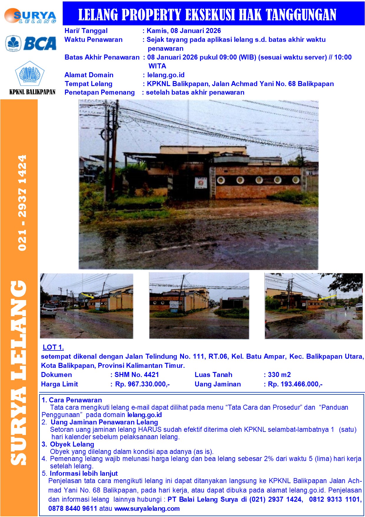 Sebidang tanah seluas 330 m2 berikut bangunan sesuai SHM No. 4421, setempat dikenal dengan Jalan Telindung No. 111, RT.06, Kel. Batu Ampar, Kec. Balikpapan Utara, Kota Balikpapan, Propinsi Kalimantan Timur