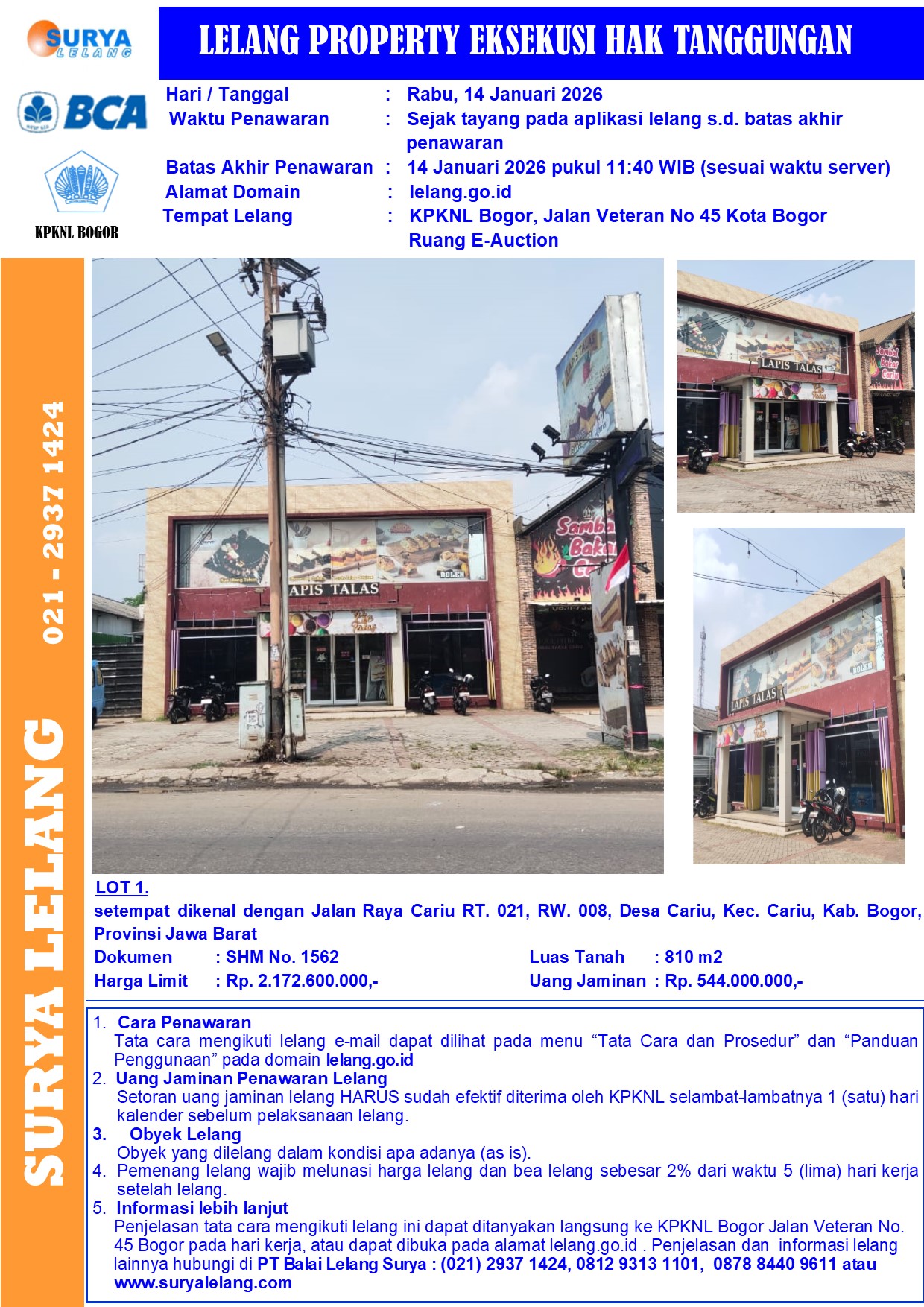 Sebidang tanah seluas 810 m2 berikut bangunan sesuai SHM No. 1562, setempat dikenal dengan Jalan Raya Cariu RT. 021, RW. 008, Desa (dh. Desa/Kel) Cariu, Kec. Cariu, Kab. (dh. Kab/Kota) Bogor, Provinsi Jawa Barat