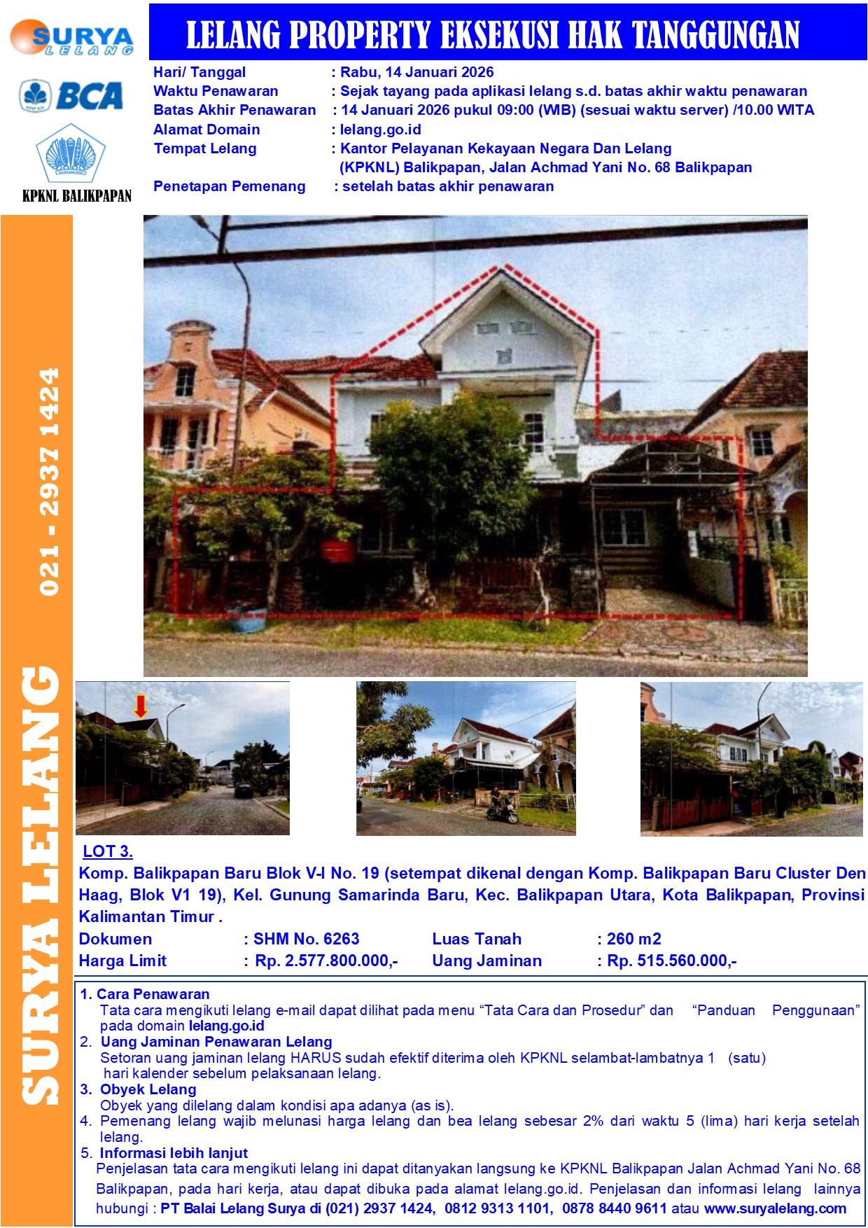 Sebidang tanah seluas 260 m2 berikut bangunan (Rumah Tinggal) sesuai SHM No. 6263, terletak di Komp. Balikpapan Baru Blok V-I No. 19 (setempat dikenal dengan Komp. Balikpapan Baru Cluster Den Haag, Blok V1 19), Kel. Gunung Samarinda Baru, Kec. Balikpapan Utara, Kota Balikpapan, Provinsi Kalimantan Timur