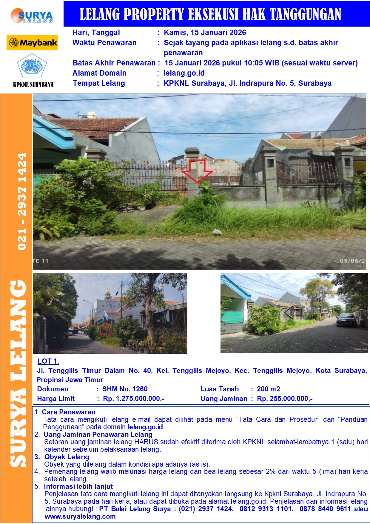 Sebidang tanah kosong seluas 200 m2 sesuai SHM No. 1260, terletak di Jl. Tenggilis Timur Dalam No. 40, Kel. Tenggilis Mejoyo, Kec. Tenggilis Mejoyo, Kota Surabaya, Propinsi Jawa Timur