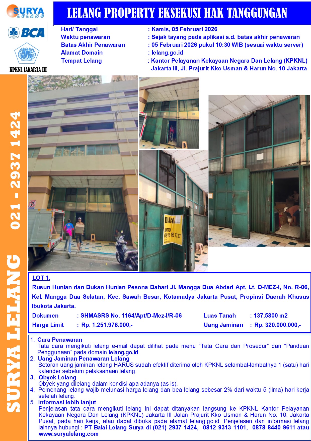 1 (satu) unit Ruko seluas 137,5800 m2 sesuai SHMASRS No. 1164/Apt/D-Mez-I/R-06, terletak di Rusun Hunian dan Bukan Hunian Pesona Bahari Jl. Mangga Dua Abdad Apt, Lt. D-MEZ-I, No. R-06, Kel. Mangga Dua Selatan, Kec. Sawah Besar, Kotamadya Jakarta Pusat, Propinsi Daerah Khusus Ibukota Jakarta