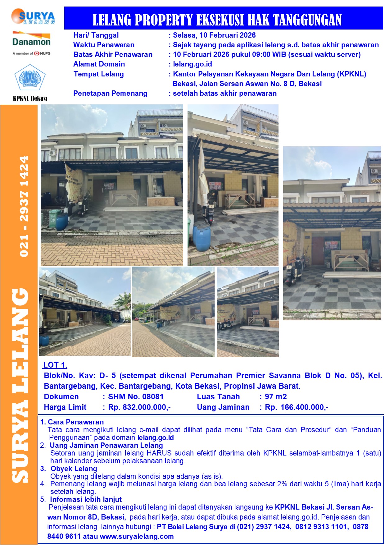Sebidang tanah seluas 97 m2 berikut bangunan sesuai SHM No. 8081, terletak di Blok/No. Kav: D- 5 (setempat dikenal Perumahan Premier Savanna Blok D No. 05), Kel Bantargebang, Kec. Bantargebang, Kota Bekasi, Provinsi Jawa Barat