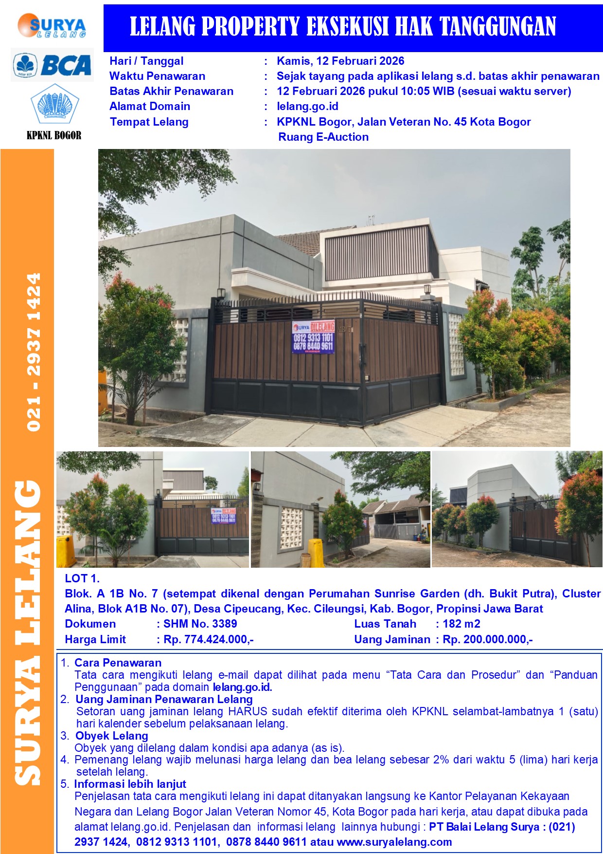 Sebidang tanah seluas 182 m2 berikut bangunan sesuai SHM No. 3389, terletak di Blok. A 1B No. 7 (setempat dikenal dengan Perumahan Sunrise Garden (dh. Bukit Putra), Cluster Alina, Blok A1B No. 07), Desa Cipeucang, Kec. Cileungsi, Kab. Bogor, Propinsi Jawa Barat