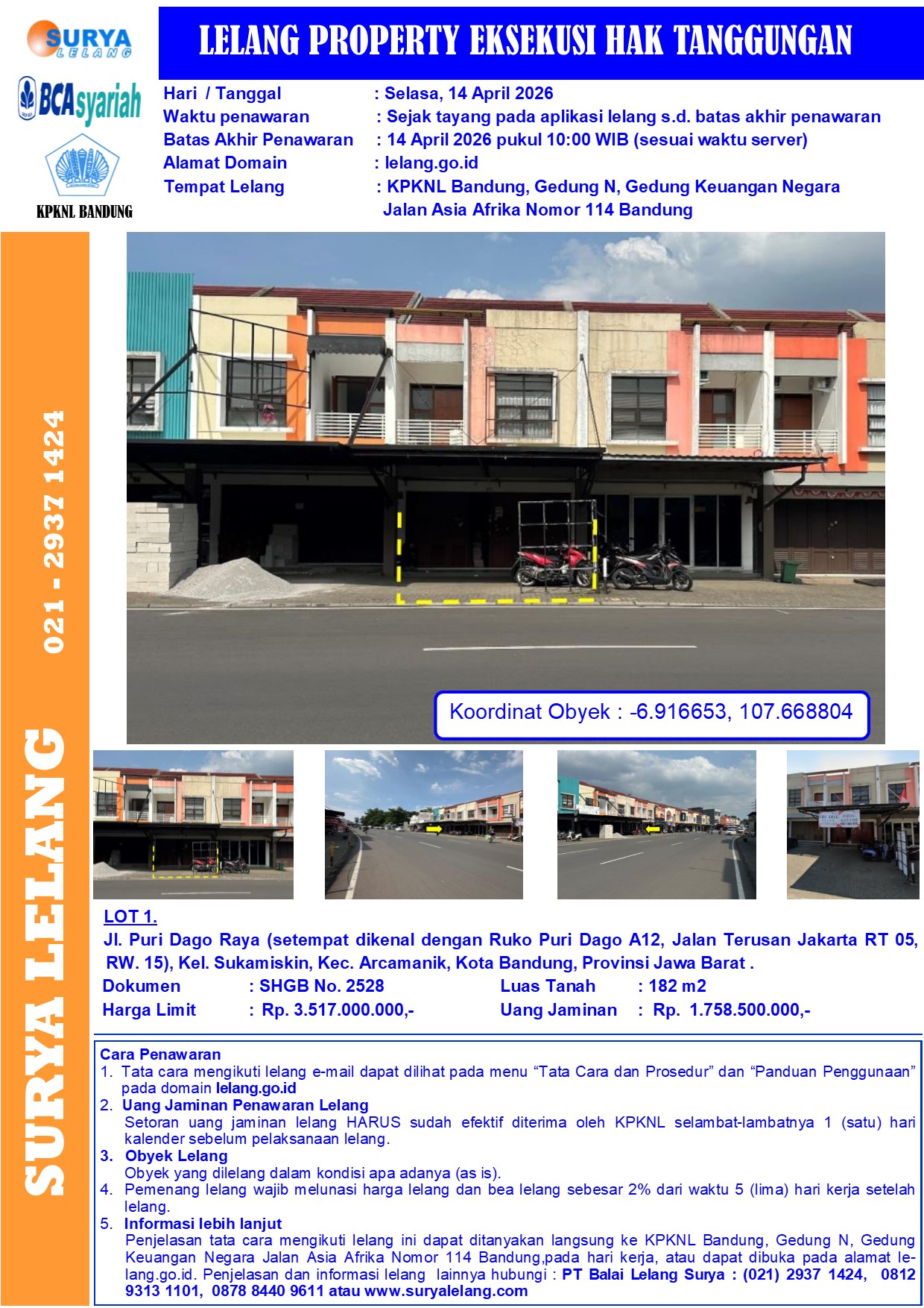 Sebidang tanah seluas 182 m2 berikut bangunan sesuai SHGB No. 2528, terletak di Jl. Puri Dago Raya (setempat dikenal dengan Ruko Puri Dago A12, Jalan Terusan Jakarta RT 05, RW. 15), Kel. Sukamiskin, Kec. Arcamanik, Kota Bandung, Provinsi Jawa Barat