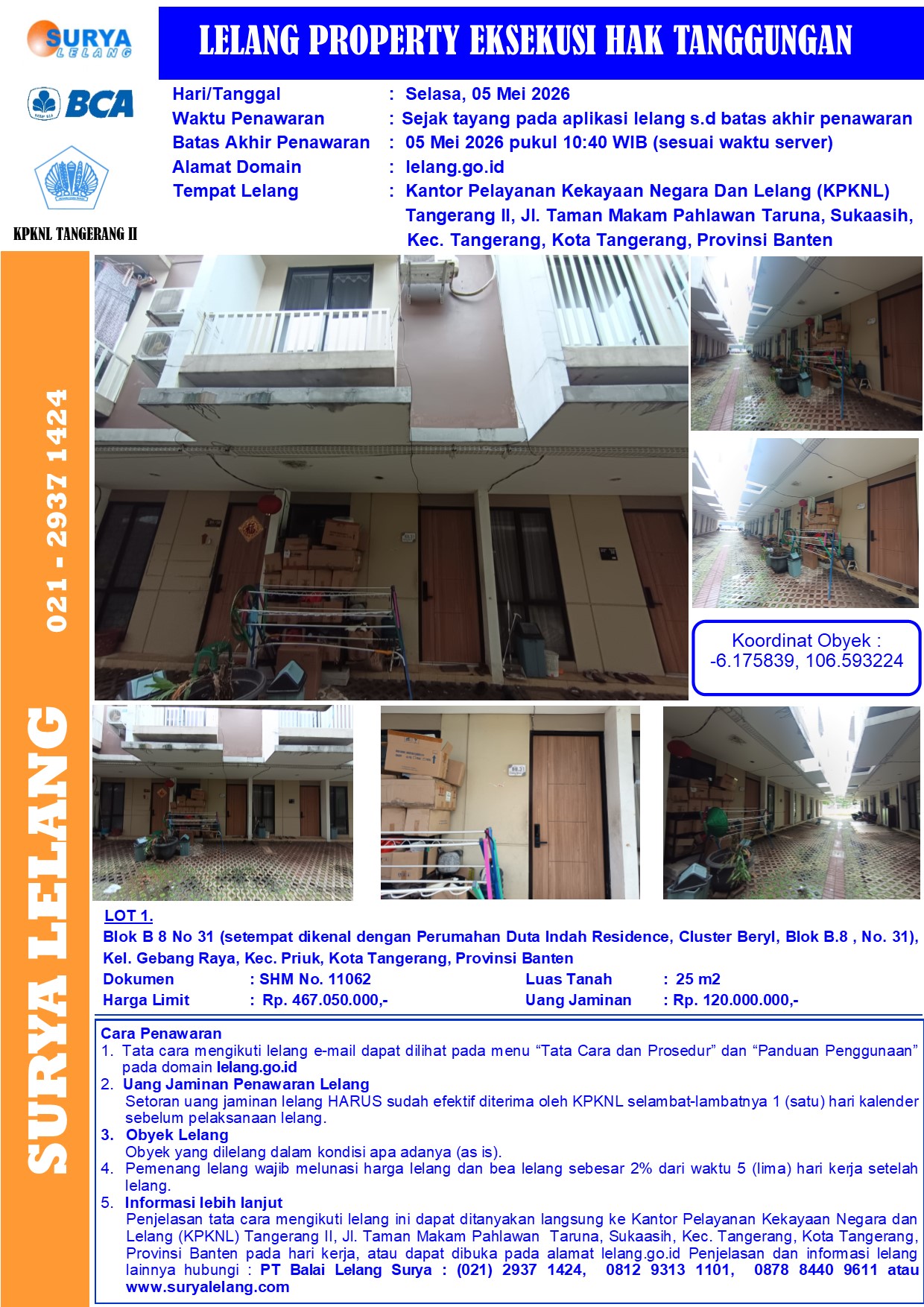 Sebidang tanah seluas 25 m2 berikut bangunan sesuai SHM No. 11062/Gebang Raya, terletak di Blok B 8 No 31, Kel. Gebang Raya, Kec. Periuk, Kota Tangerang, Provinsi Banten (sesuai sertipikat),