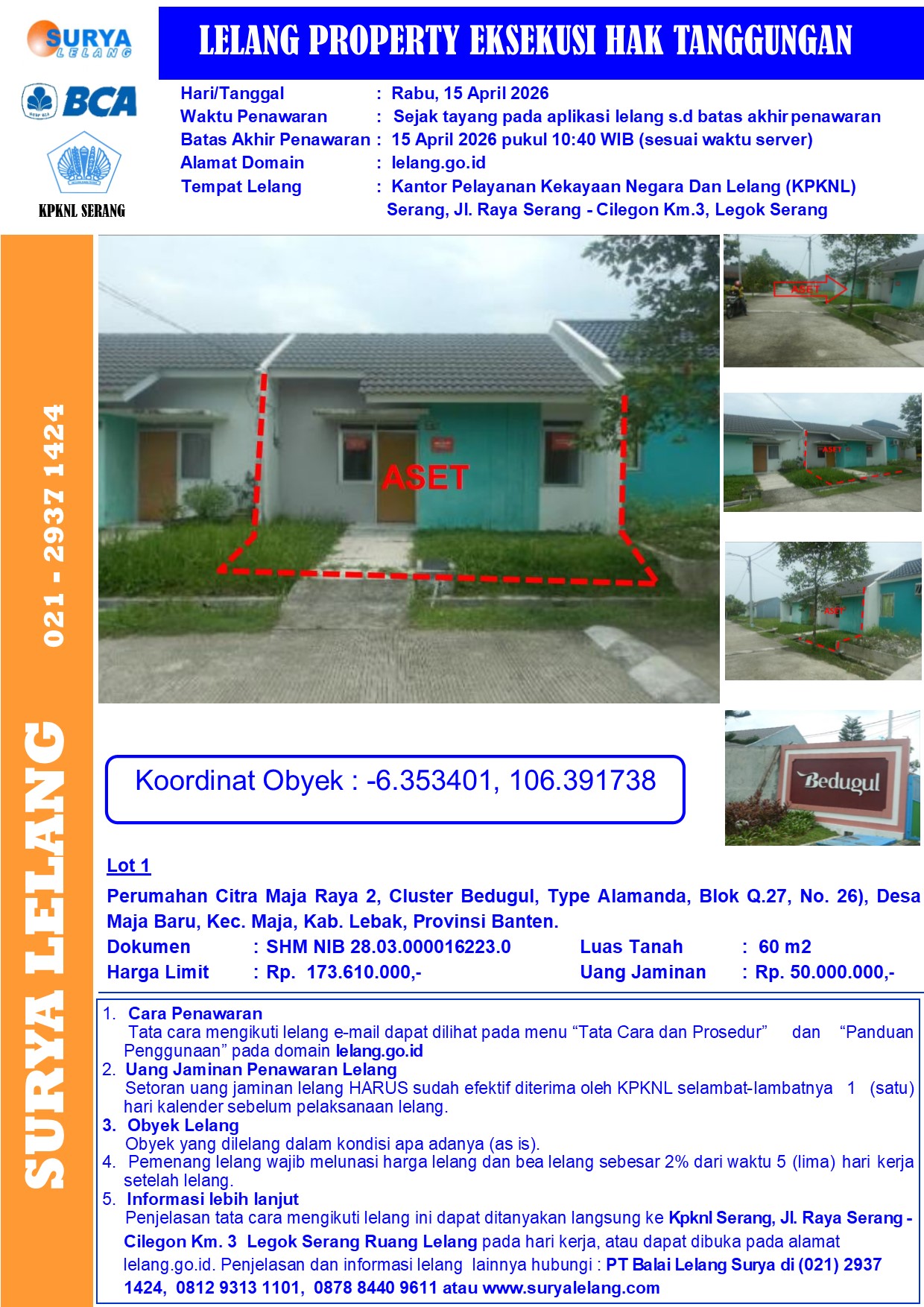 Sebidang tanah seluas 60 m2 berikut bangunan sesuai Sertipikat Hak Milik NIB 28.03.000016223.0, setempat dikenal dengan Perumahan Citra Maja Raya 2, Cluster Bedugul, Type Alamanda, Blok Q.27, No. 26, Desa Maja Baru, Kec. Maja, Kab. Lebak, Provinsi Banten