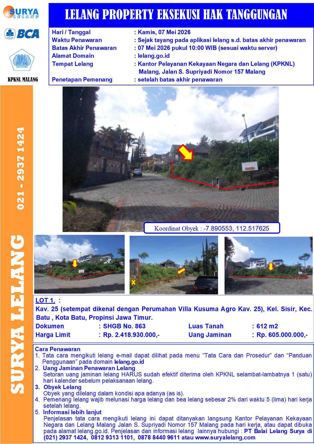 Sebidang tanah kosong seluas 612 m2 sesuai SHGB No. 863, terletak di Kav. 25 Kel. Sisir, Kec. Batu,