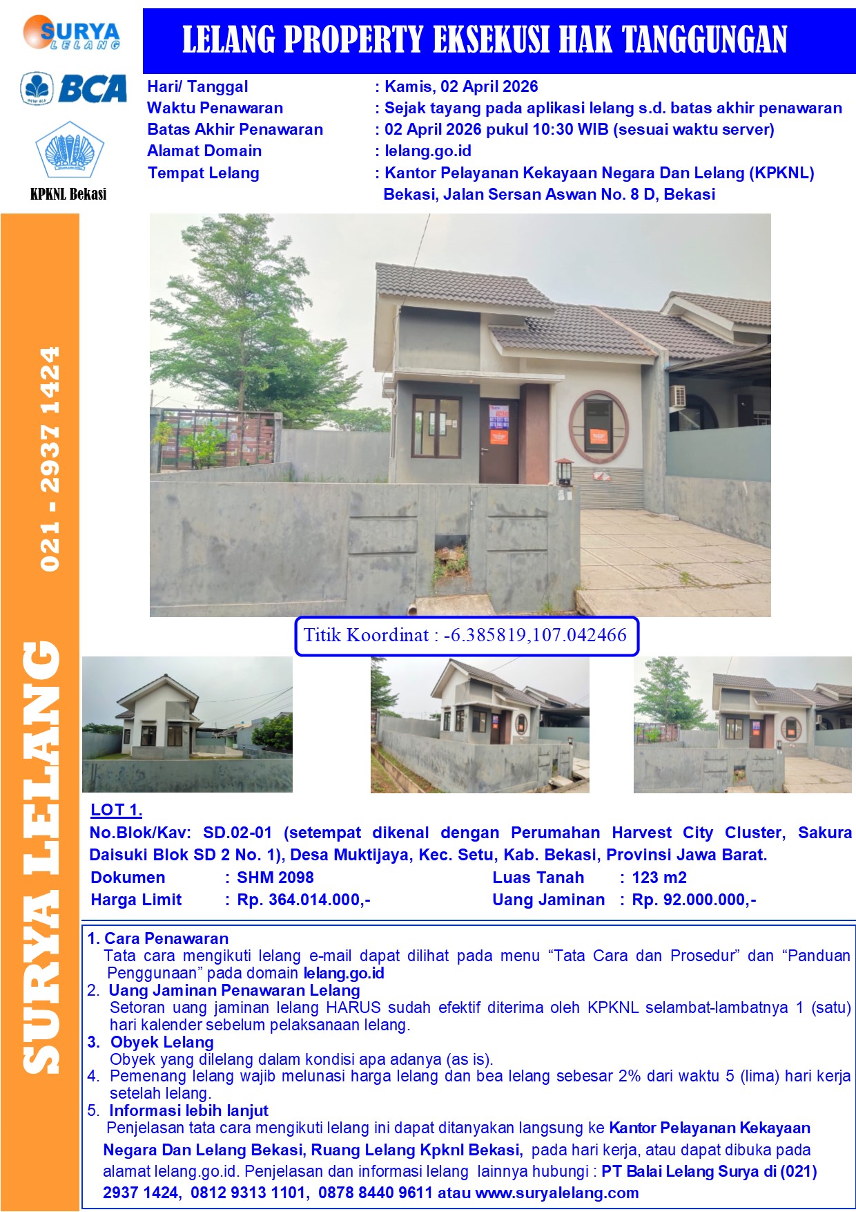 Sebidang tanah seluas 123 m2 berikut bangunan sesuai SHM No. 2098, terletak di No.Blok/Kav: SD.02-01 (setempat dikenal dengan Perumahan Harvest City Cluster Sakura Daisuki Blok SD 2 No. 1), Desa Muktijaya, Kec. Setu, Kab. Bekasi, Provinsi Jawa Barat