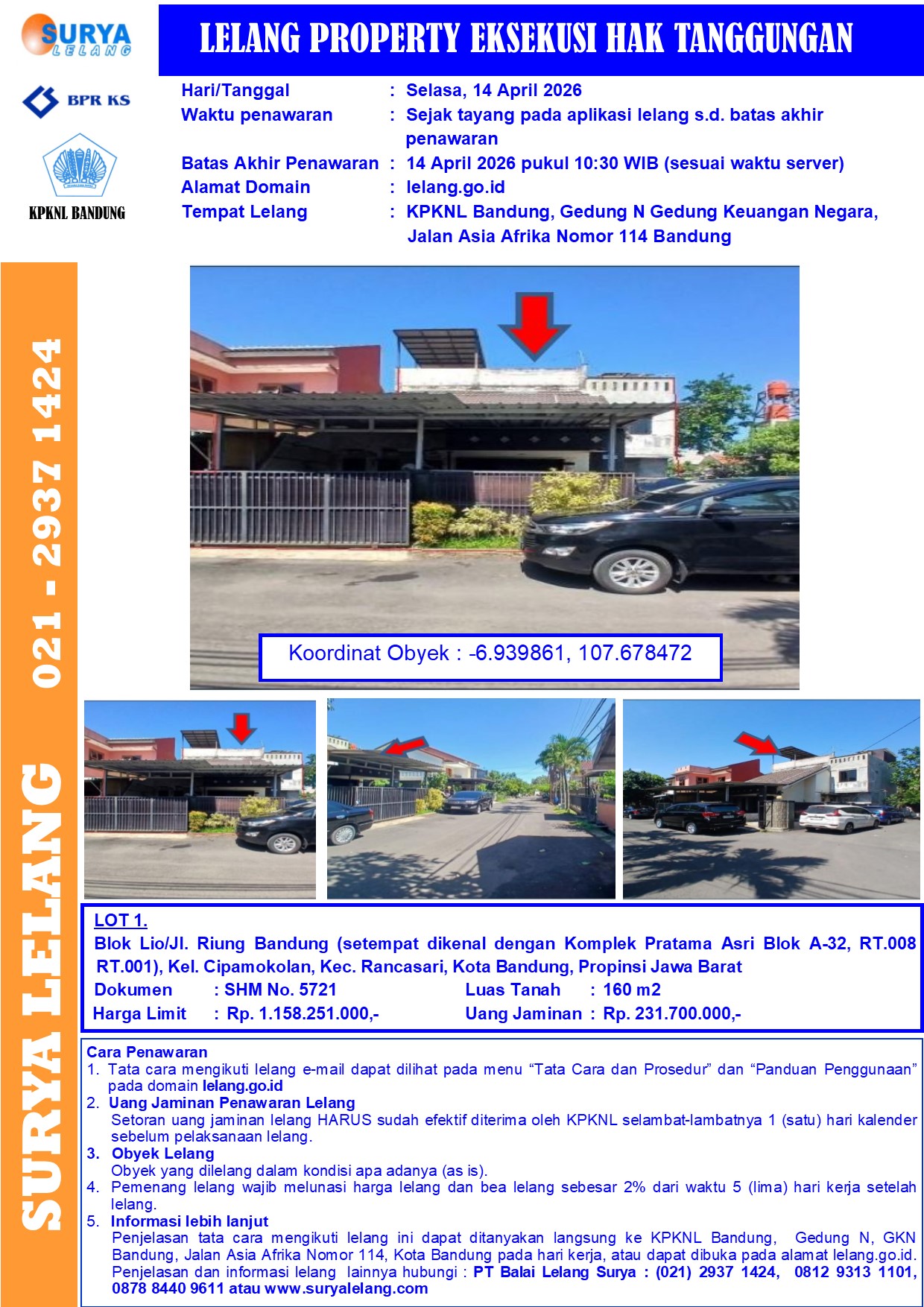 Sebidang tanah seluas 160 m2 berikut bangunan sesuai SHM No. 5721, terletak di Blok Lio/Jl. Riung Bandung (setempat dikenal dengan Komplek Pratama Asri A-32, RT.008 RT.001, Kel. Cipamokolan, Kec. Rancasari, Kota Bandung, Propinsi Jawa Barat
