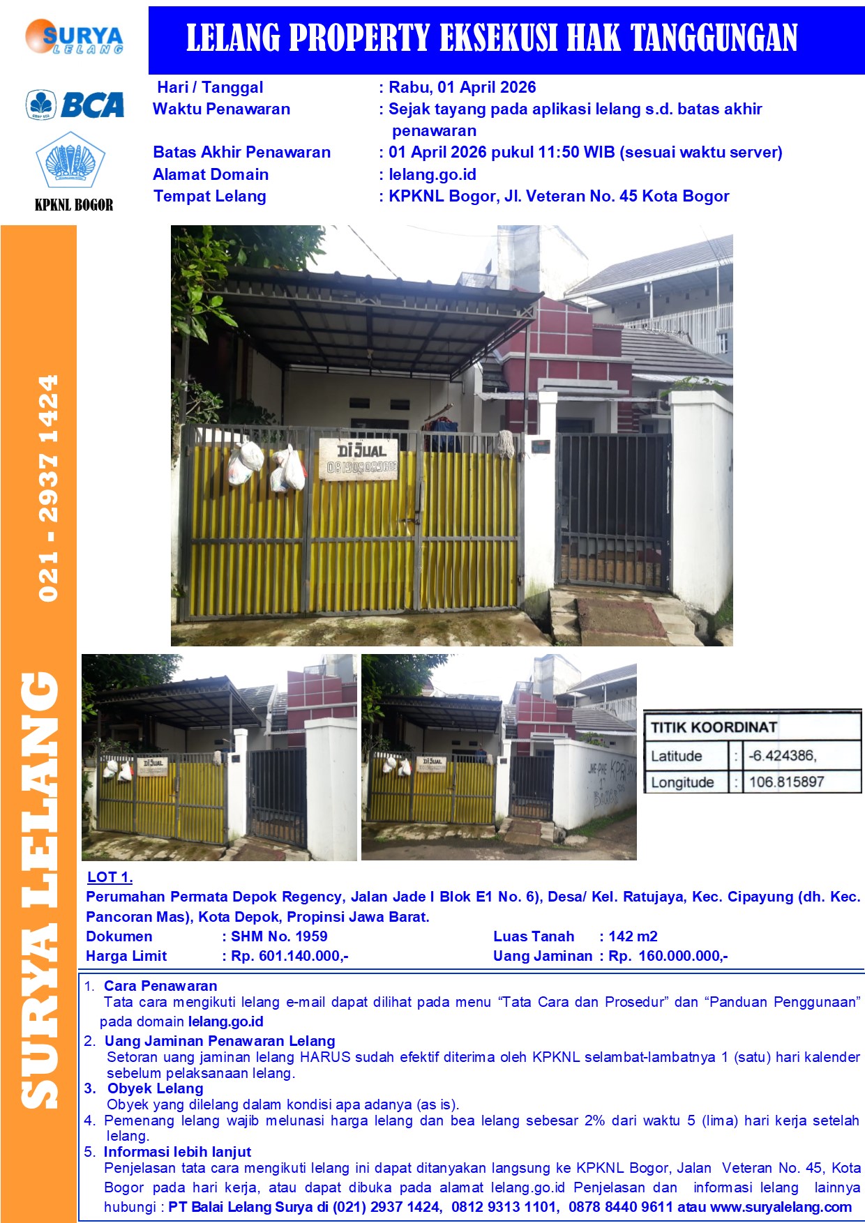 Sebidang tanah seluas 142 m2 berikut bangunan sesuai SHM No. 1959, terletak di Blok E 1 No. 6 (setempat dikenal dengan Perumahan Permata Depok Regency, Jalan Jade I Blok E1 No. 6), Desa/ Kel. Ratujaya, Kec. Cipayung (dh. Kec. Pancoran Mas), Kota Depok, Propinsi Jawa Barat