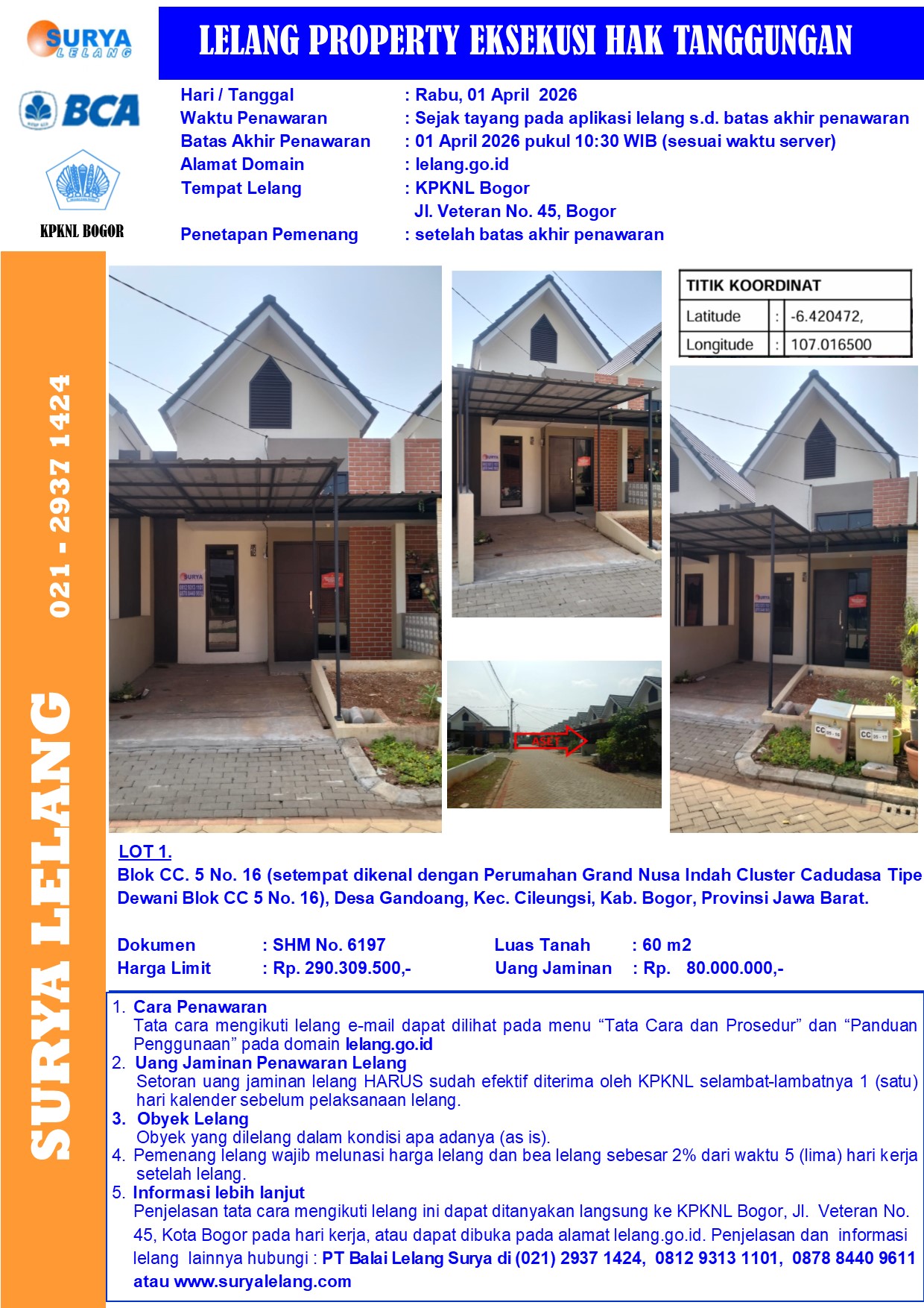 Sebidang tanah seluas 60 m2 berikut bangunan sesuai SHM No. 6197, terletak di Blok CC. 5 No. 16 (setempat dikenal dengan Perumahan Grand Nusa Indah Cluster Cadudasa Tipe Dewani Blok CC 5 No. 16), Desa Gandoang, Kec. Cileungsi, Kab. Bogor, Provinsi Jawa Barat