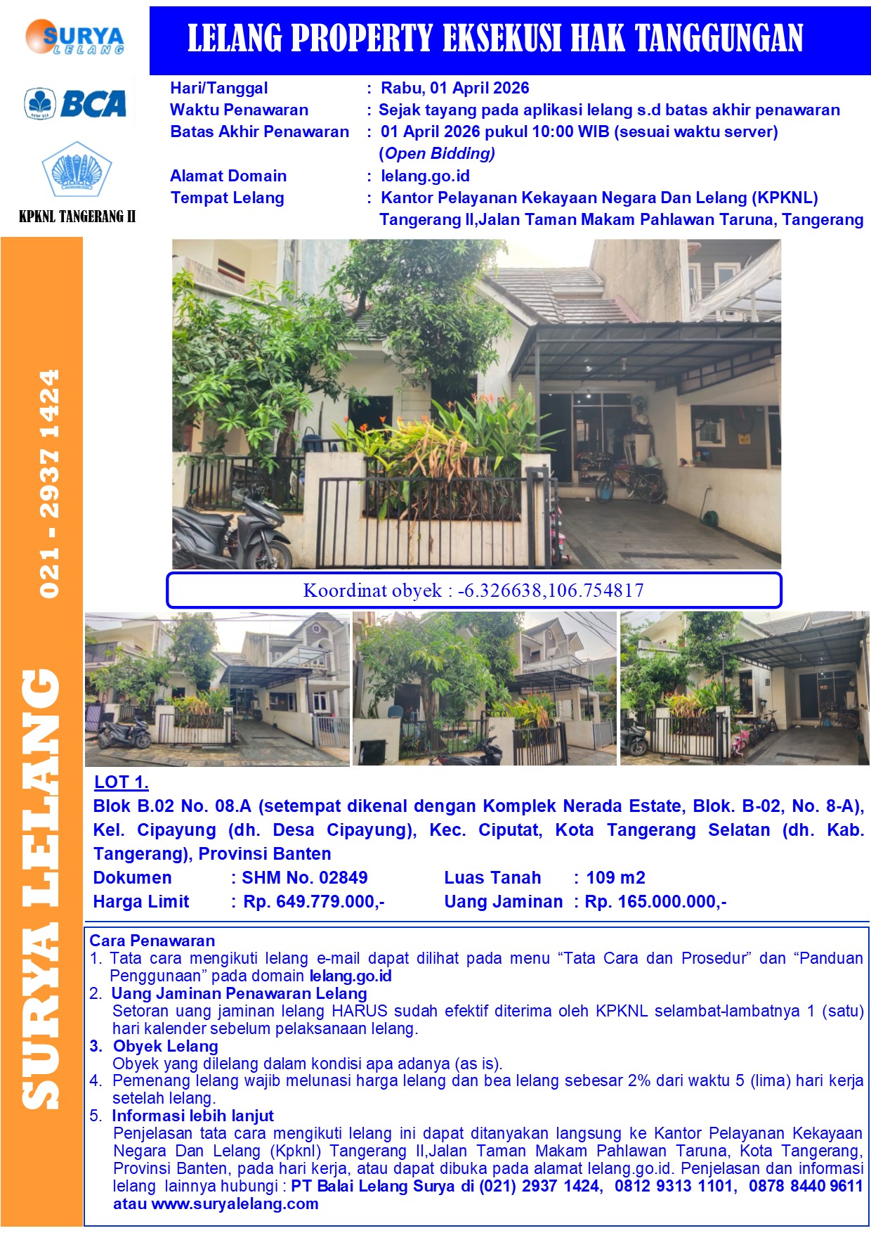setempat dikenal dengan Komplek Nerada Estate, Blok. B-02, No. 8-A, Kel. Cipayung, Kec. Ciputat, Kota Tangerang Selatan (dh. Kab. Tangerang), Provinsi Banten