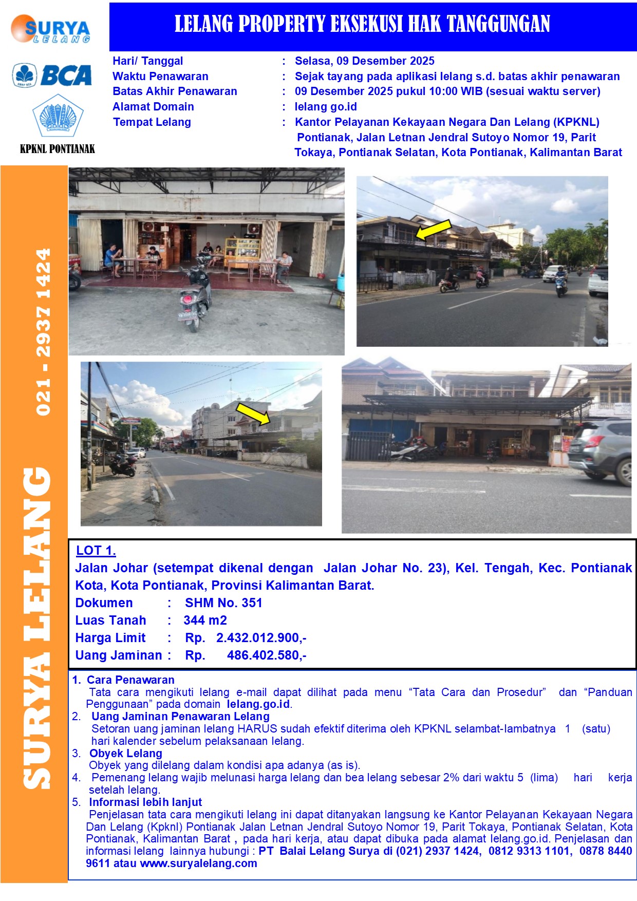 Sebidang tanah seluas 344 m2 berikut bangunan sesuai SHM No. 351, terletak di Jalan Johar (setempat dikenal dengan Jalan Johar No. 23), Kel. Tengah, Kec. Pontianak Kota, Kota Pontianak, Provinsi Kalimantan Barat
