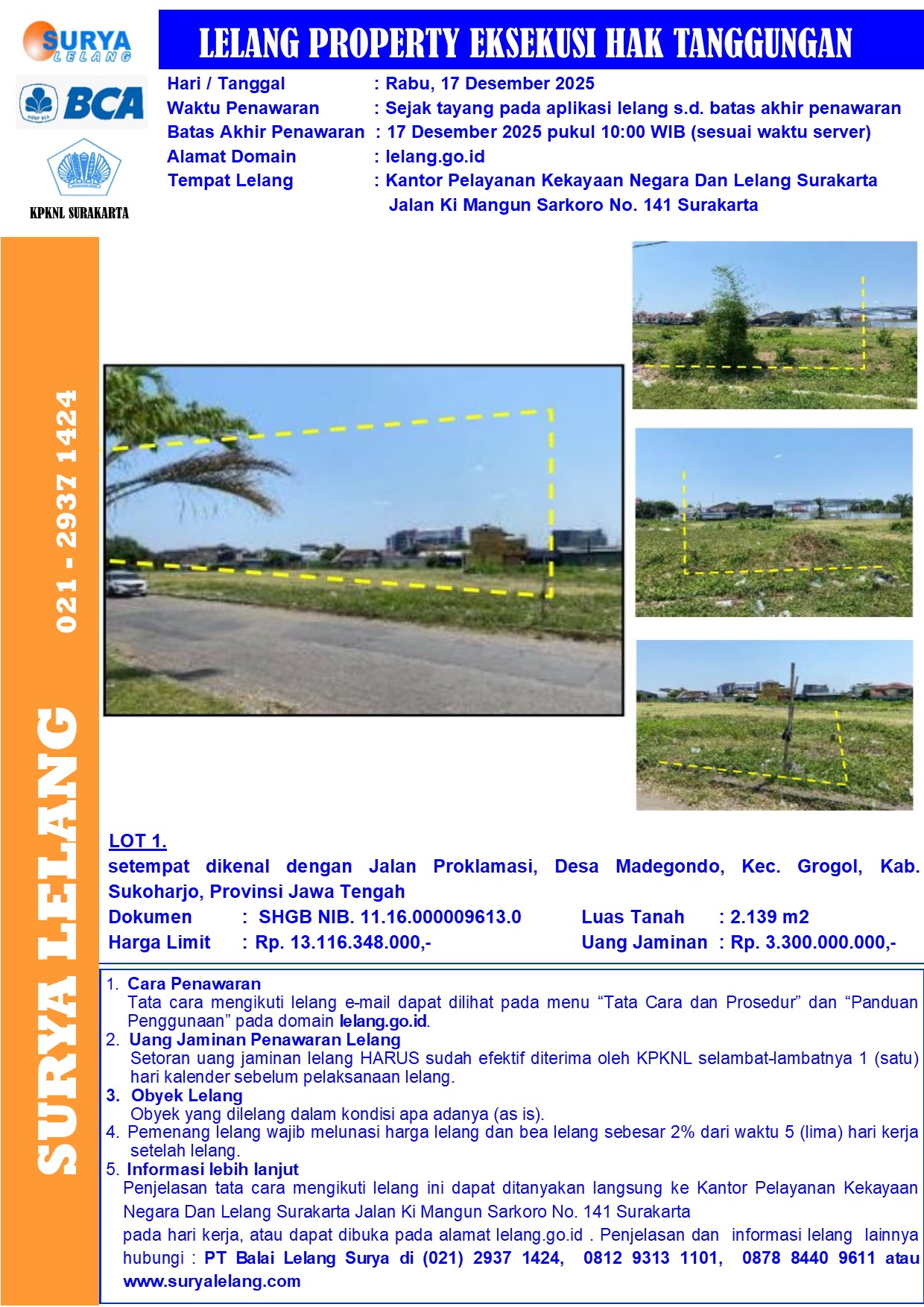 Sebidang tanah kosong seluas 2.139 m2 sesuai Sertipikat Hak Guna Bangunan NIB. 11.16.000009613.0, setempat dikenal dengan Jalan Proklamasi, Desa Madegondo, Kec. Grogol, Kab. Sukoharjo, Provinsi Jawa Tengah