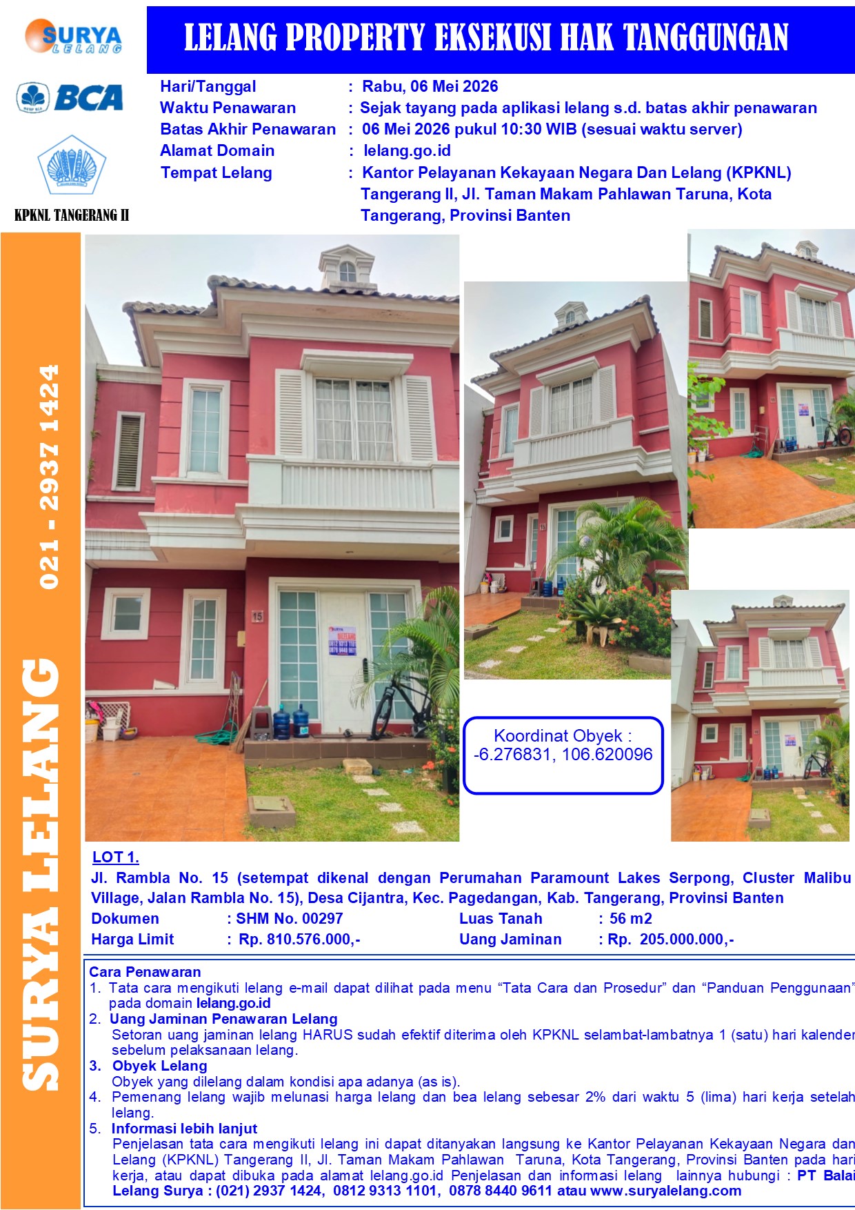 setempat dikenal dengan Perumahan Paramount Lakes Serpong, Cluster Malibu Village, Jalan Rambla No. 15, Desa Cijantra, Kec. Pagedangan, Kab. Tangerang, Provinsi Banten