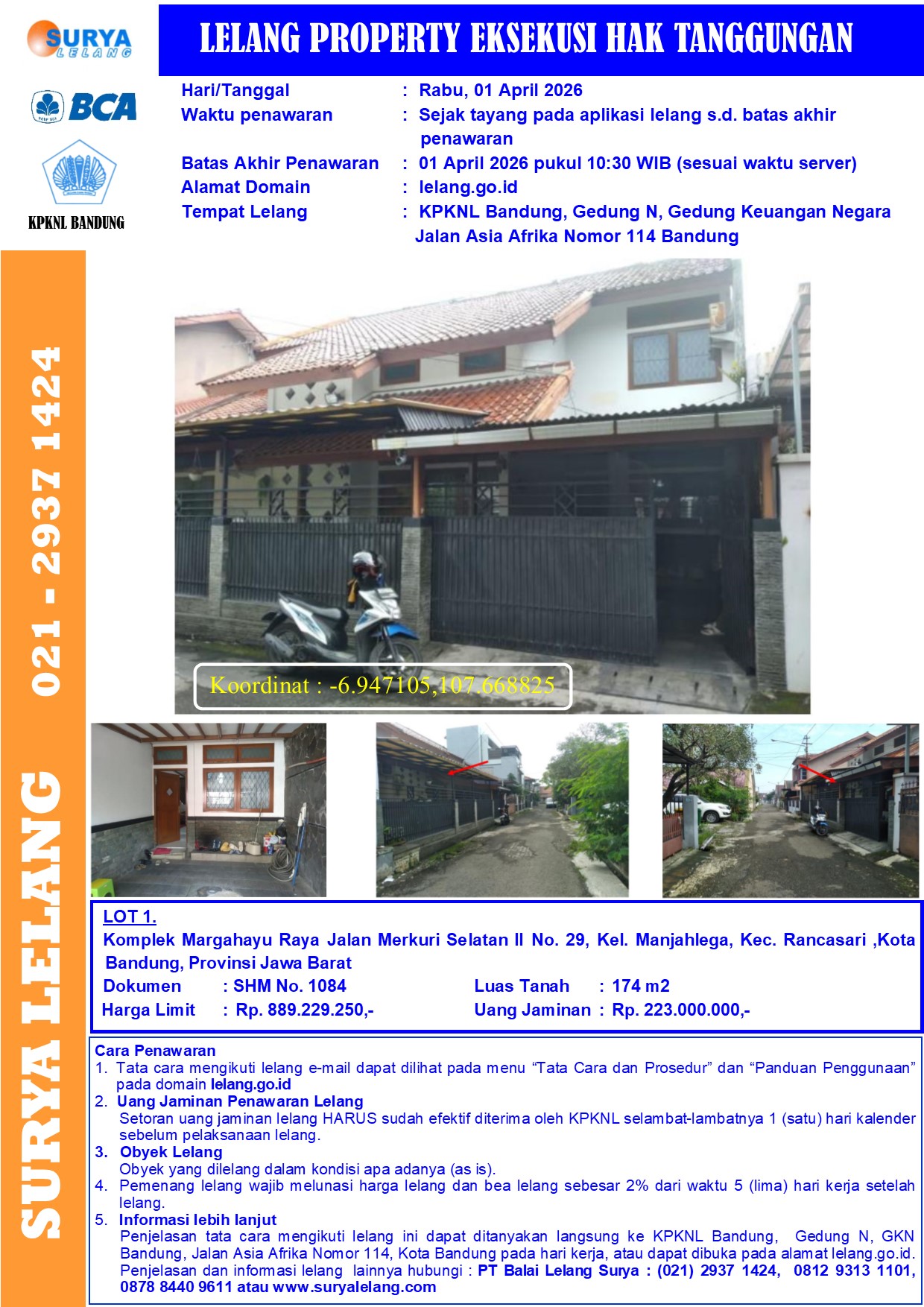 Sebidang tanah seluas 174 m2 berikut bangunan sesuai SHM No. 1084, BE, setempat dikenal dengan Komplek Margahayu Raya Jalan Merkuri Selatan II No. 29, Kel. Manjahlega, Kec. Rancasari ,Kota Bandung, Provinsi Jawa Barat