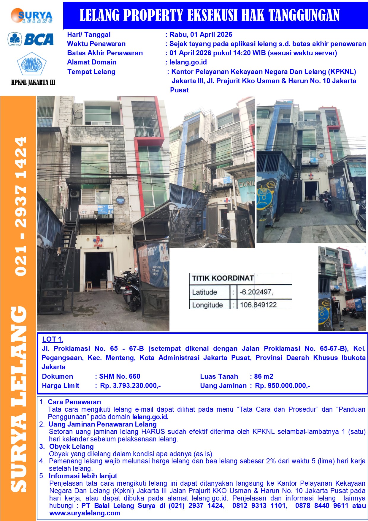 Sebidang tanah seluas 86 m2 berikut bangunan (Ruko) sesuai SHM No. 660, terletak di Jl. Proklamasi No. 65 - 67-B (setempat dikenal dengan Jalan Proklamasi No. 65-67-B), Kel. Pegangsaan, Kec. Menteng, Kota Administrasi Jakarta Pusat, Propinsi Daerah Khusus Ibukota Jakarta