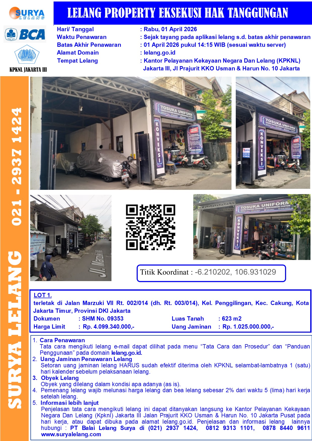 Sebidang tanah seluas 623 m2 berikut bangunan sesuai SHM No. 09353, terletak di Jalan Marzuki VII Rt. 002/014 (dh. Rt. 003/014) (setempat dikenal dengan Jalan Marzuki VII Rt. 002, Rw. 014 (d/h. Rt. 003, Rw. 014), Kel. Penggilingan, Kec. Cakung, Kota Jakarta Timur, Provinsi DKI Jakarta
