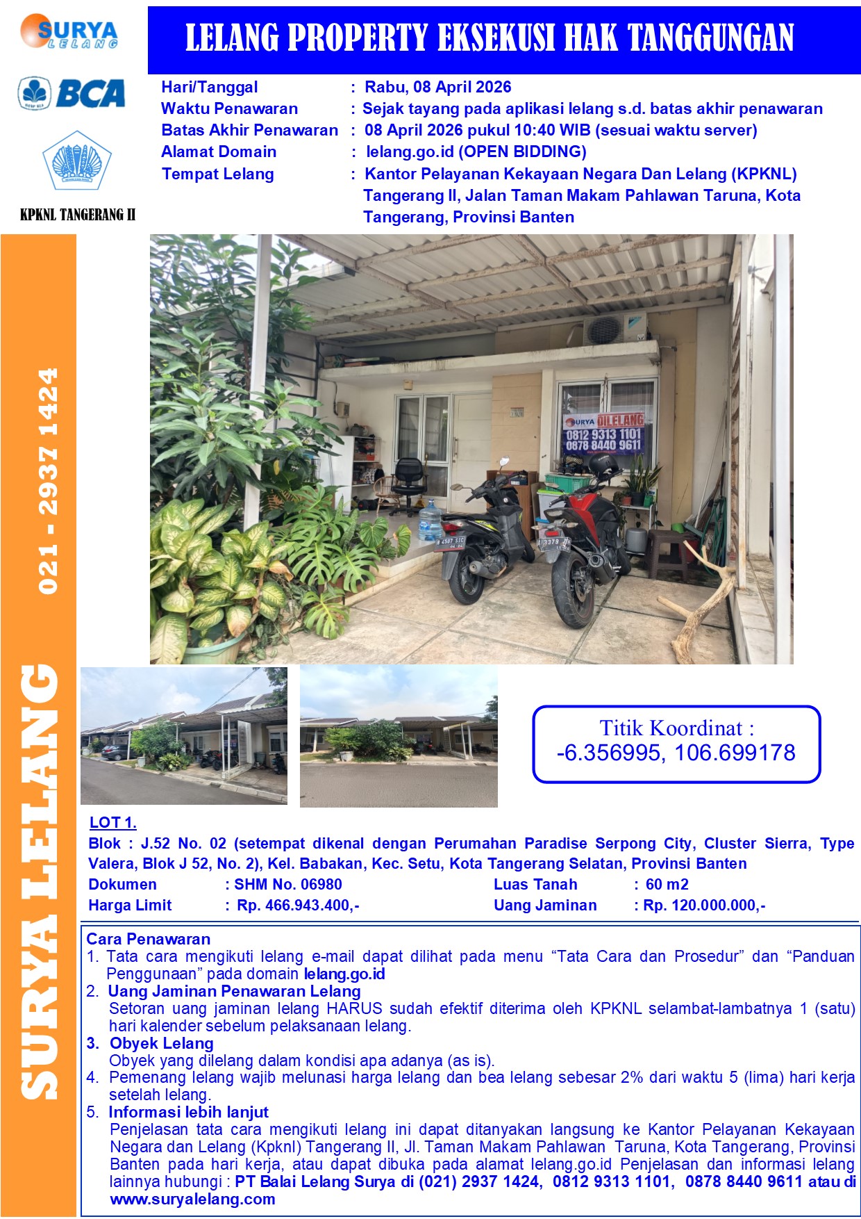 setempat dikenal dengan Perumahan Paradise Serpong City, Cluster Sierra, Type Valera, Blok J 52, No. 2, Kel. Babakan, Kec. Setu, Kota Tangerang Selatan, Provinsi Banten
