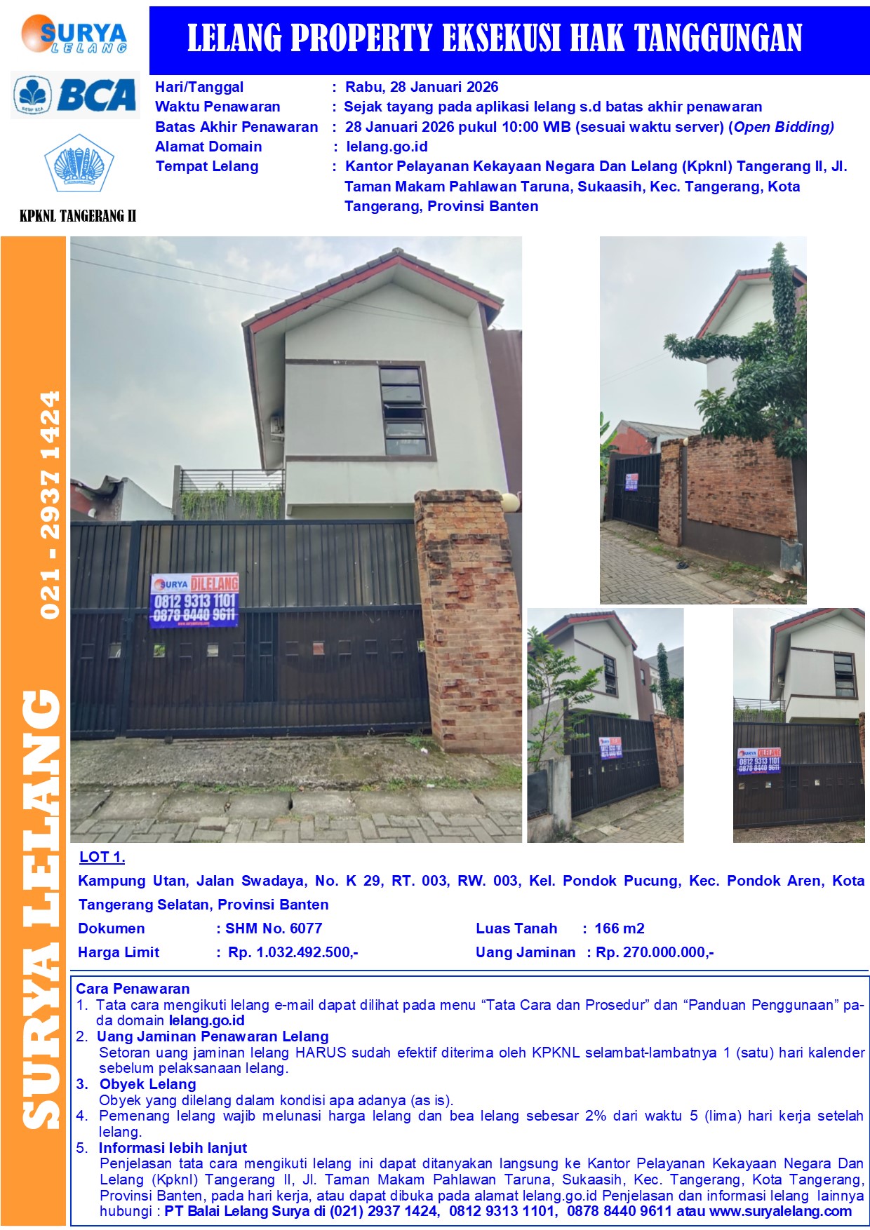 Sebidang tanah seluas 166 m2 berikut bangunan sesuai SHM No. 6077/Pondok Pucun, terletak di Blok : 14, Kel. Pondok Pucung, Kec. Pondok Aren, Kota