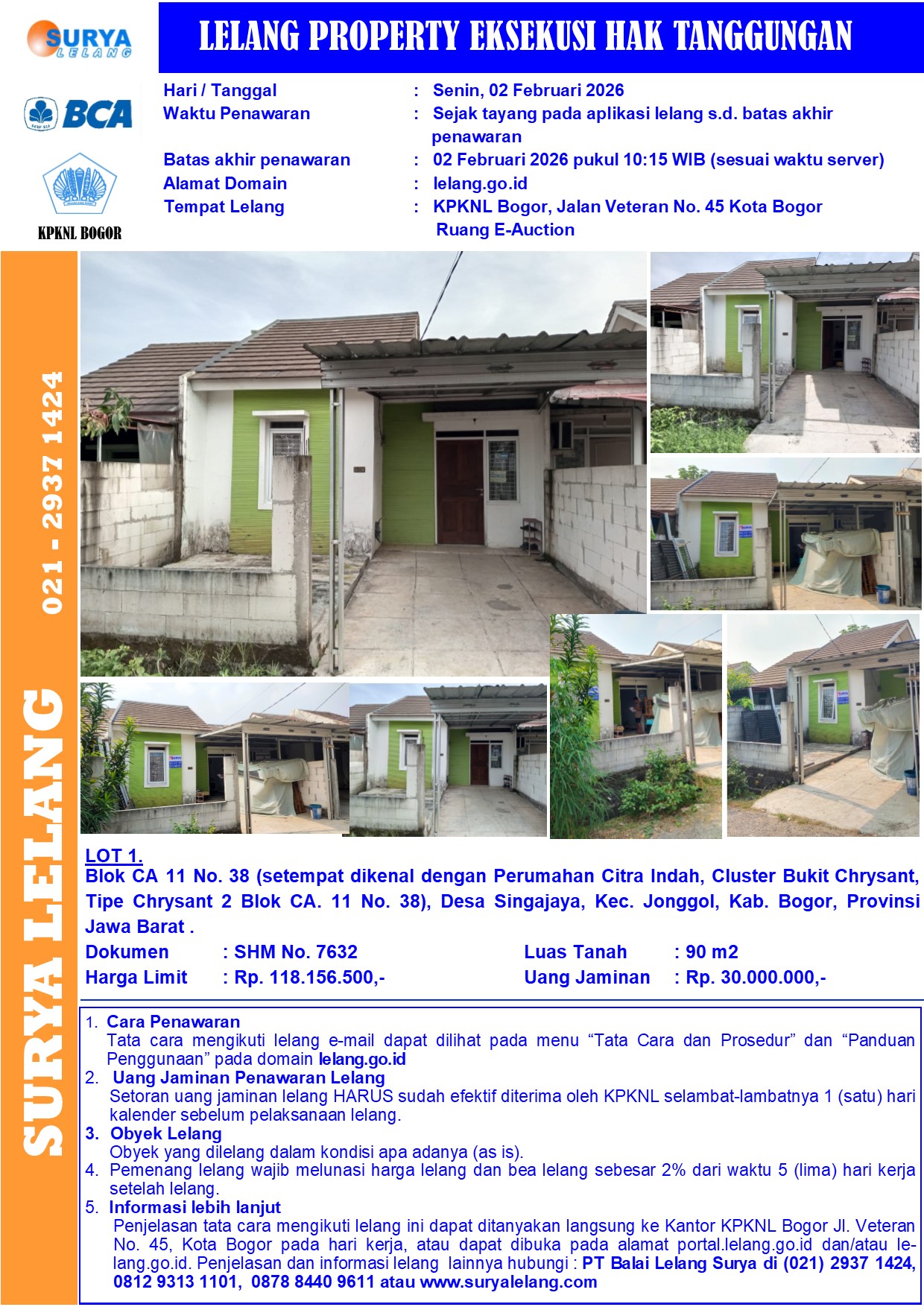 Sebidang tanah seluas 90 m2 berikut bangunan sesuai SHM No. 7632, terletak di Blok CA 11 No. 38 (setempat dikenal dengan Perumahan Citra Indah, Cluster Bukit Chrysant, Tipe Chrysant 2 Blok CA. 11 No. 38), Desa Singajaya, Kec. Jonggol, Kab. Bogor, Provinsi Jawa Barat