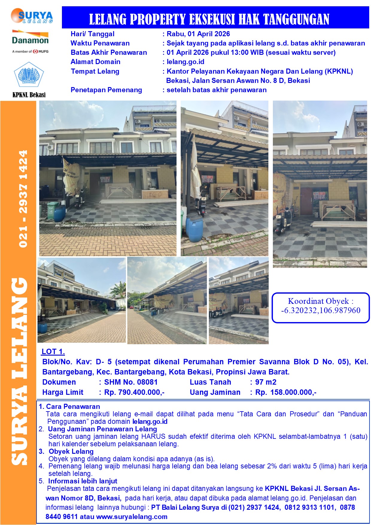 Sebidang tanah seluas 97 m2 berikut bangunan sesuai SHM No. 8081, terletak di Blok/No. Kav: D- 5 (setempat dikenal Perumahan Premier Savanna Blok D No. 05), Kel Bantargebang, Kec. Bantargebang, Kota Bekasi, Provinsi Jawa Barat