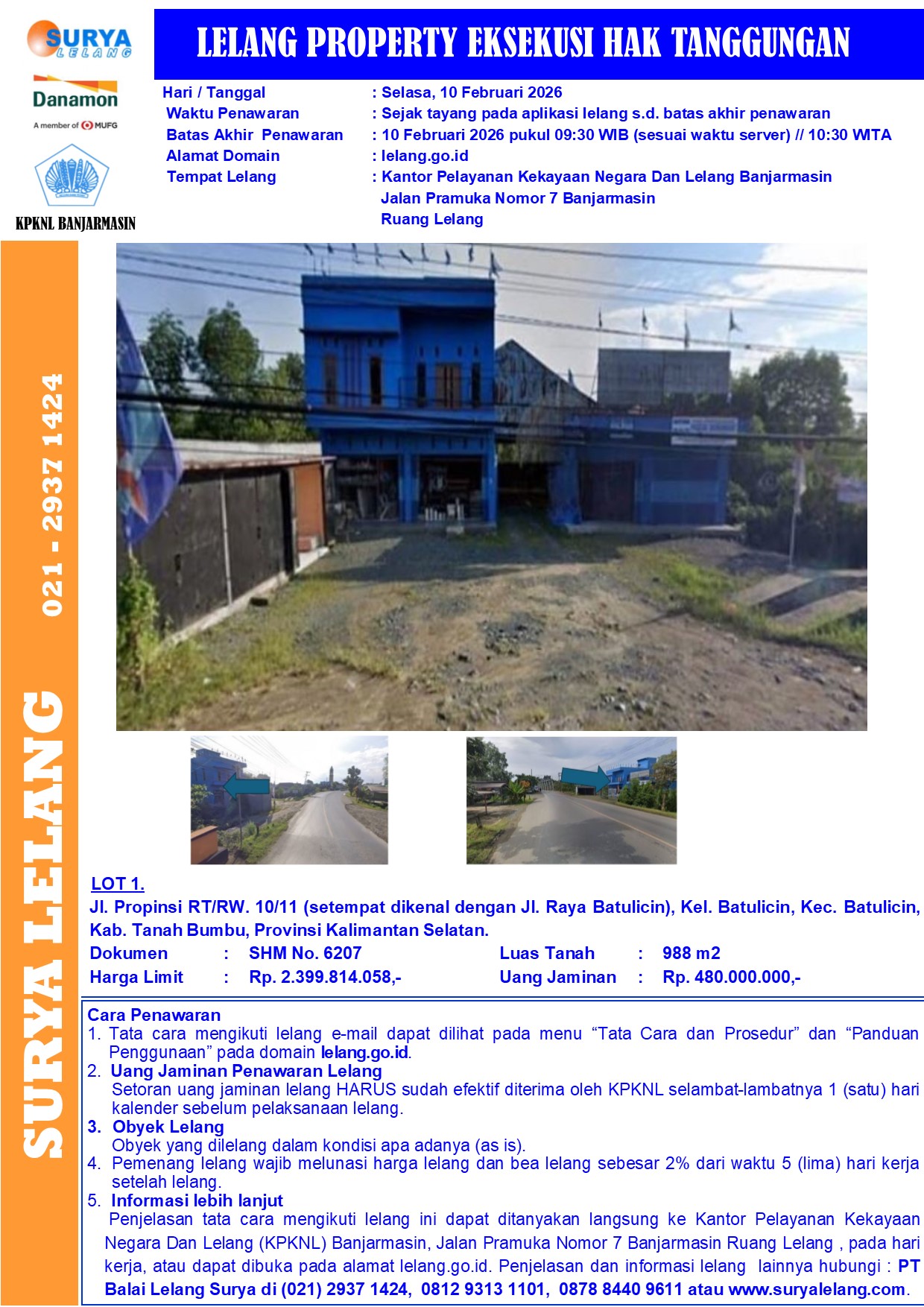 Sebidang tanah seluas 988 m2 berikut bangunan sesuai SHM No. 06207, Sarjana Administrasi Publik, terletak di Jalan Propinsi RT/RW. 10/11 (setempat dikenal dengan Jl. Raya Batulicin), Kel. Batulicin, Kec. Batulicin, Kab. Tanah Bumbu, Provinsi Kalimantan Selatan