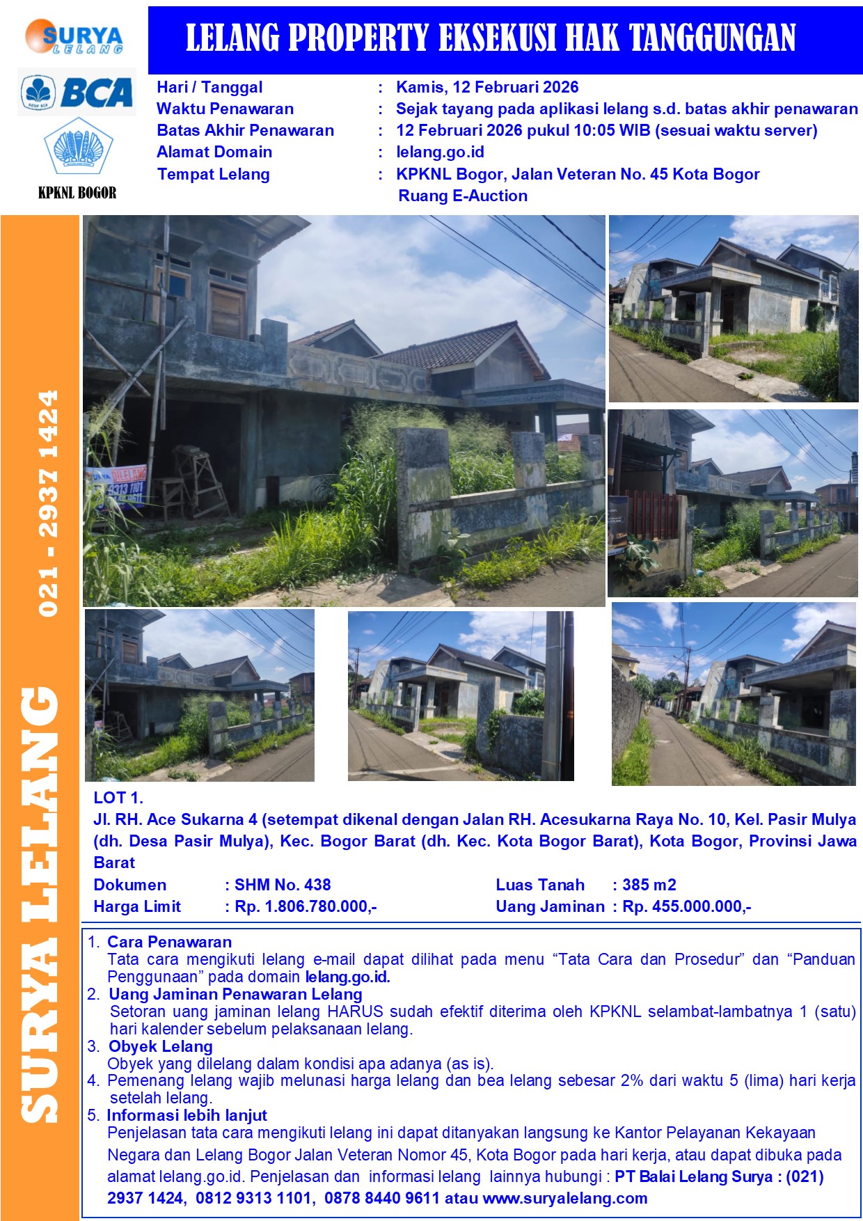 Sebidang tanah seluas 385 m2 berikut bangunan sesuai SHM No. 438, terletak di Jl. RH. Ace Sukarna 4 (setempat dikenal dengan Jalan RH. Acesukarna Raya No. 10, Kel. Pasir Mulya (dh. Desa Pasir Mulya), Kec. Bogor Barat (dh. Kec. Kota Bogor Barat), Kota Bogor, Provinsi Jawa Barat