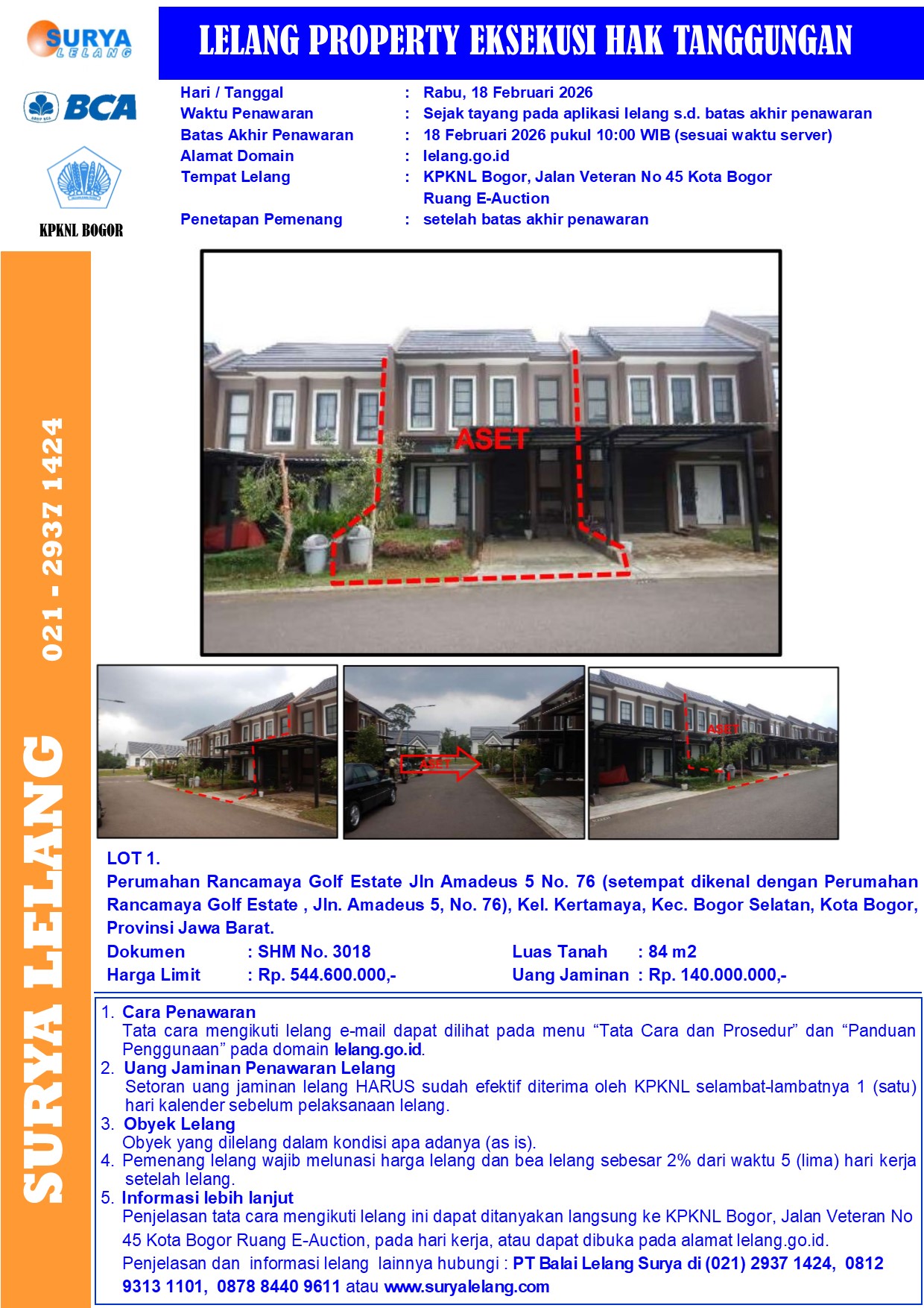 Sebidang tanah seluas 84 m2 berikut bangunan sesuai SHM No. 3018, terletak di Perumahan Rancamaya Golf Estate Jln Amadeus 5 No. 76 (setempat dikenal dengan Perumahan Rancamaya Golf Estate , Jln. Amadeus 5, No. 76), Kel. Kertamaya, Kec. Bogor Selatan, Kota Bogor, Provinsi Jawa Barat