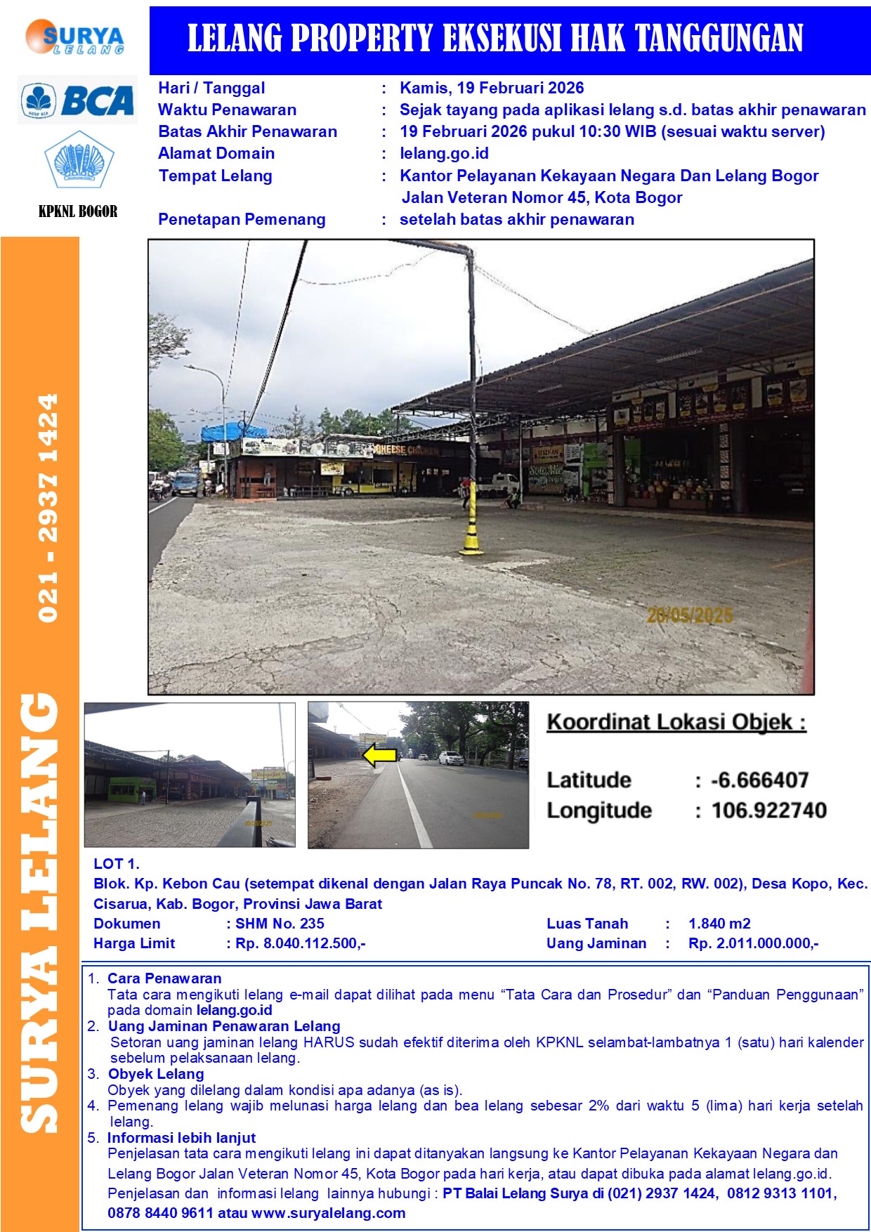 Sebidang tanah seluas 1.840 m2 berikut bangunan sesuai SHM No. 235, terletak di Blok. Kp. Kebon Cau (setempat dikenal dengan Jalan Raya Puncak No. 78, RT. 002, RW. 02), Desa Kopo, Kec. Cisarua, Kab. Bogor, Propinsi Jawa Barat