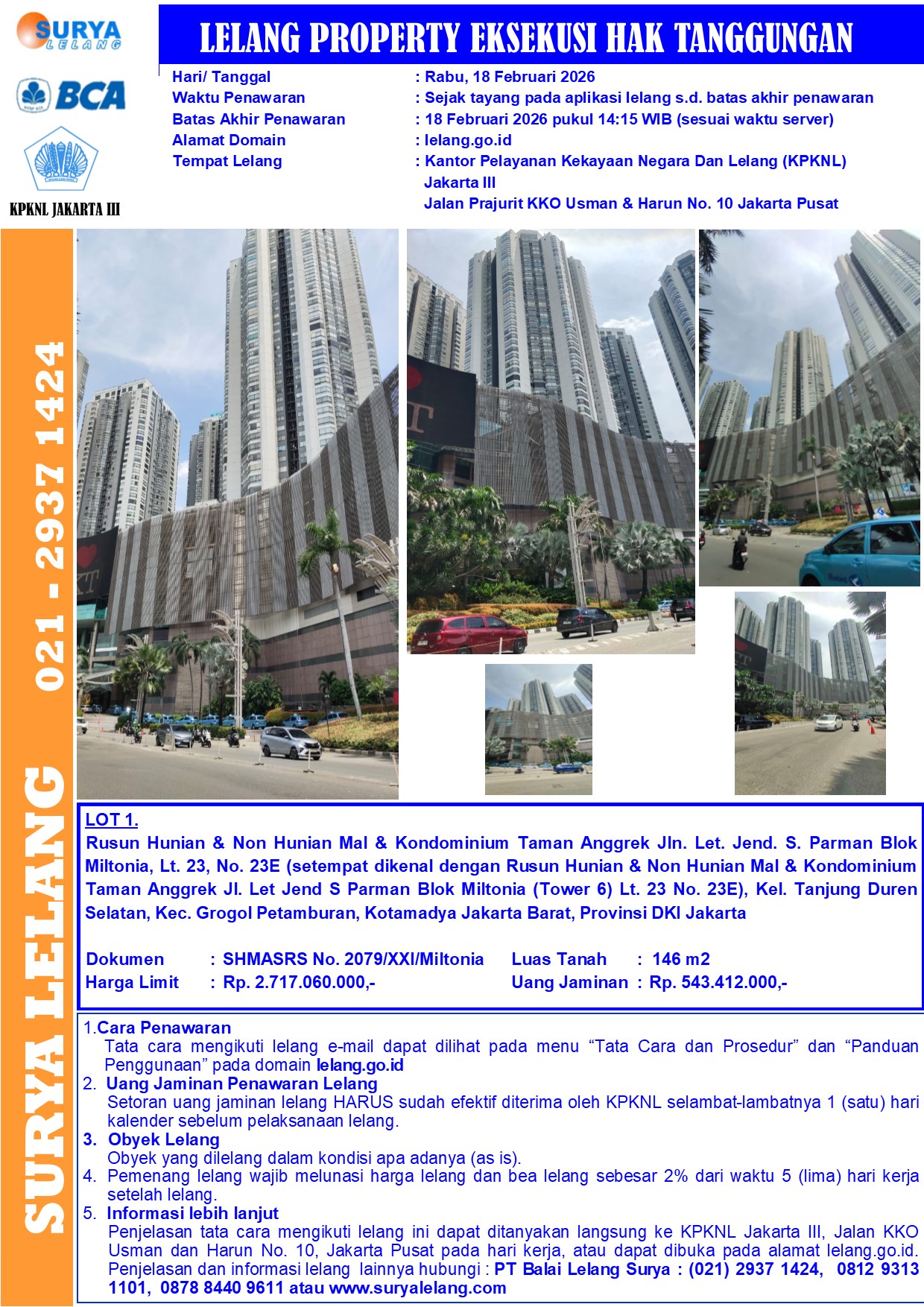 1 (satu) unit Apartemen seluas 146,00 m2 sesuai SHMASRS No. 2079/XXI/Miltonia,  terletak di Rusun Hunian & Non Hunian Mal & Kondominium Taman Anggrek Jln. Let. Jend. S. Parman Blok Miltonia, Lt. 23, No. 23E (setempat dikenal dengan Rusun Hunian & Non Hunian Mal & Kondominium Taman Anggrek Jl. Let Jend S Parman Blok Miltonia (Tower 6) Lt. 23 No. 23E), Kel. Tanjung Duren Selatan, Kec. Grogol Petamburan, Kotamadya Jakarta Barat, Propinsi Daerah Khusus Ibukota Jakarta