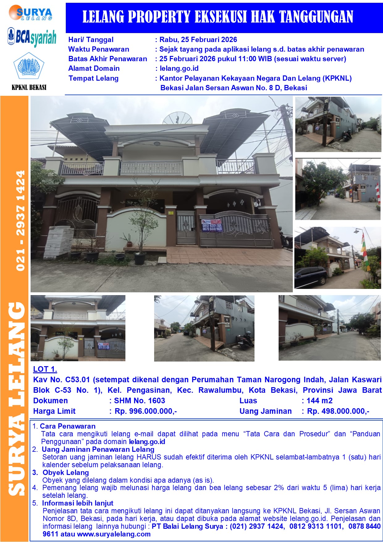 Sebidang tanah seluas 144 m2 berikut bangunan sesuai SHM No. 1603, terletak di Kav No. C53.01 (setempat dikenal dengan Perumahan Taman Narogong Indah, Jalan Kaswari Blok C-53 No. 1), Kel. Pengasinan, Kec. Rawalumbu (dh. Bekasi Timur), Kota (dh. Kab) Bekasi, Provinsi Jawa Barat