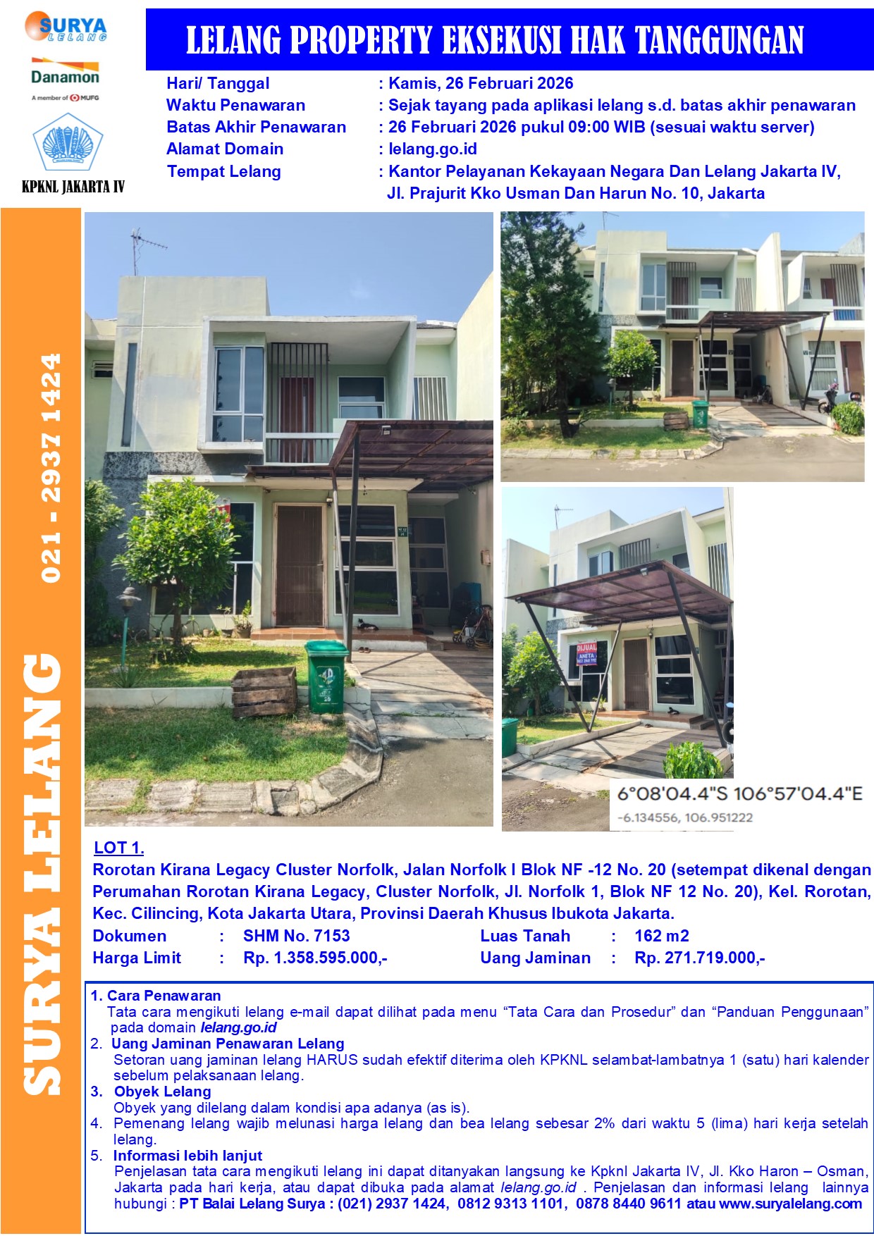 Sebidang tanah seluas 162 m2 berikut bangunan sesuai SHM No. 7153, terletak di Rorotan Kirana Legacy Cluster Norfolk, Jalan Norfolk I Blok NF -12 No. 20 (setempat dikenal dengan Perumahan Rorotan Kirana Legacy, Cluster Norfolk, Jl. Norfolk 1, Blok NF 12 No. 20), Kel. Rorotan, Kec. Cilincing, Kota Jakarta Utara, Provinsi Daerah Khusus Ibukota Jakarta