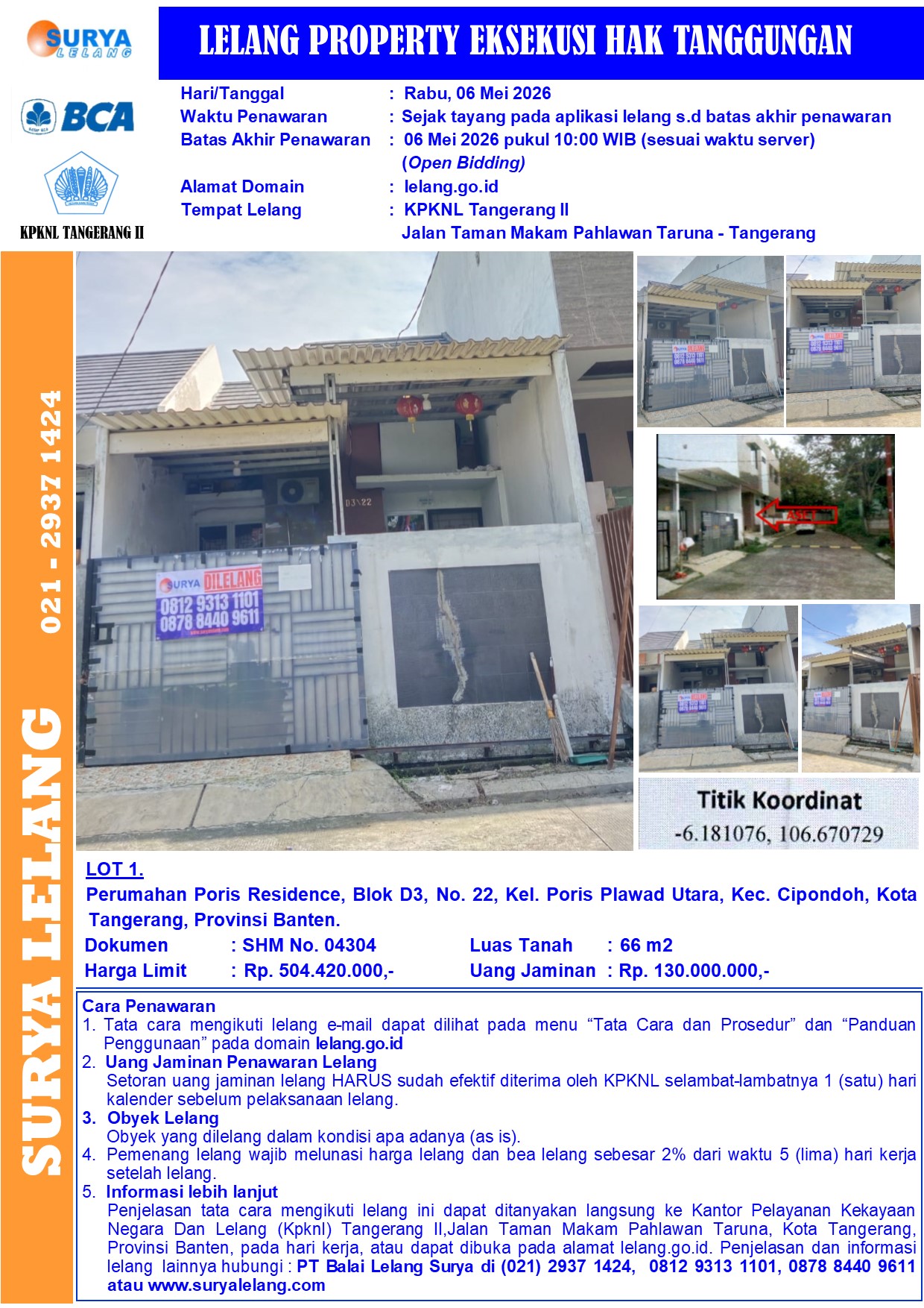 setempat dikenal dengan Perumahan Poris Residence, Blok D3, No. 22, Kel. Poris Plawad Utara, Kec. Cipondoh, Kota Tangerang, Provinsi Banten