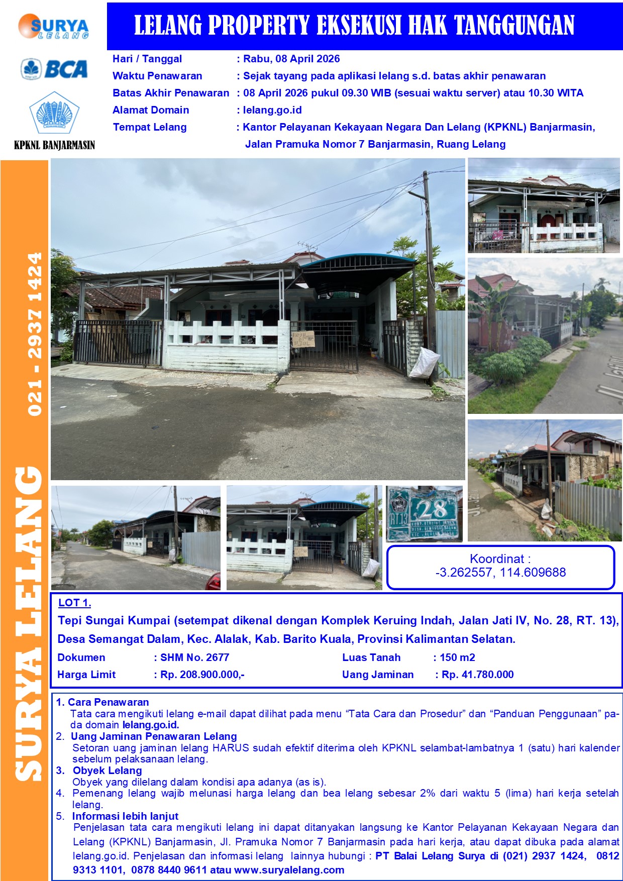 Sebidang tanah seluas 150 m2 berikut bangunan sesuai SHM No. 2677, terletak di Tepi Sungai Kumpai (setempat dikenal dengan Komplek Keruing Indah, Jalan Jati IV, No. 28, RT. 13), Desa Semangat Dalam, Kec. Alalak, Kab. Barito Kuala, Provinsi Kalimantan Selatan