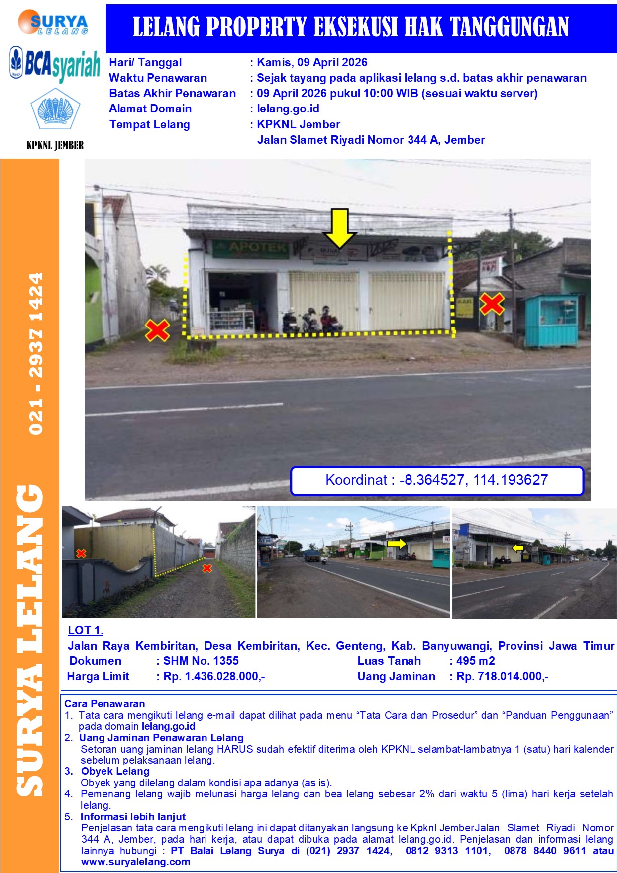 Sebidang tanah seluas 495 m2 berikut bangunan sesuai SHM No. 1355, setempat dikenal dengan Jalan Raya Kembiritan, Desa Kembiritan, Kec. Genteng, Kab. Banyuwangi, Propinsi Jawa Timur