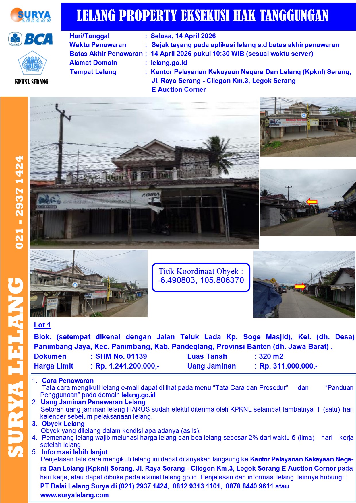 Sebidang tanah seluas 320 m2 berikut bangunan sesuai SHM No. 01139, terletak di Blok. (setempat dikenal dengan Jalan Teluk Lada Kp. Soge Masjid), Kelurahan (dh. Desa) Panimbang Jaya, Kec. Panimbang, Kab. Pandeglang, Provinsi Banten (dh. Jawa Barat)