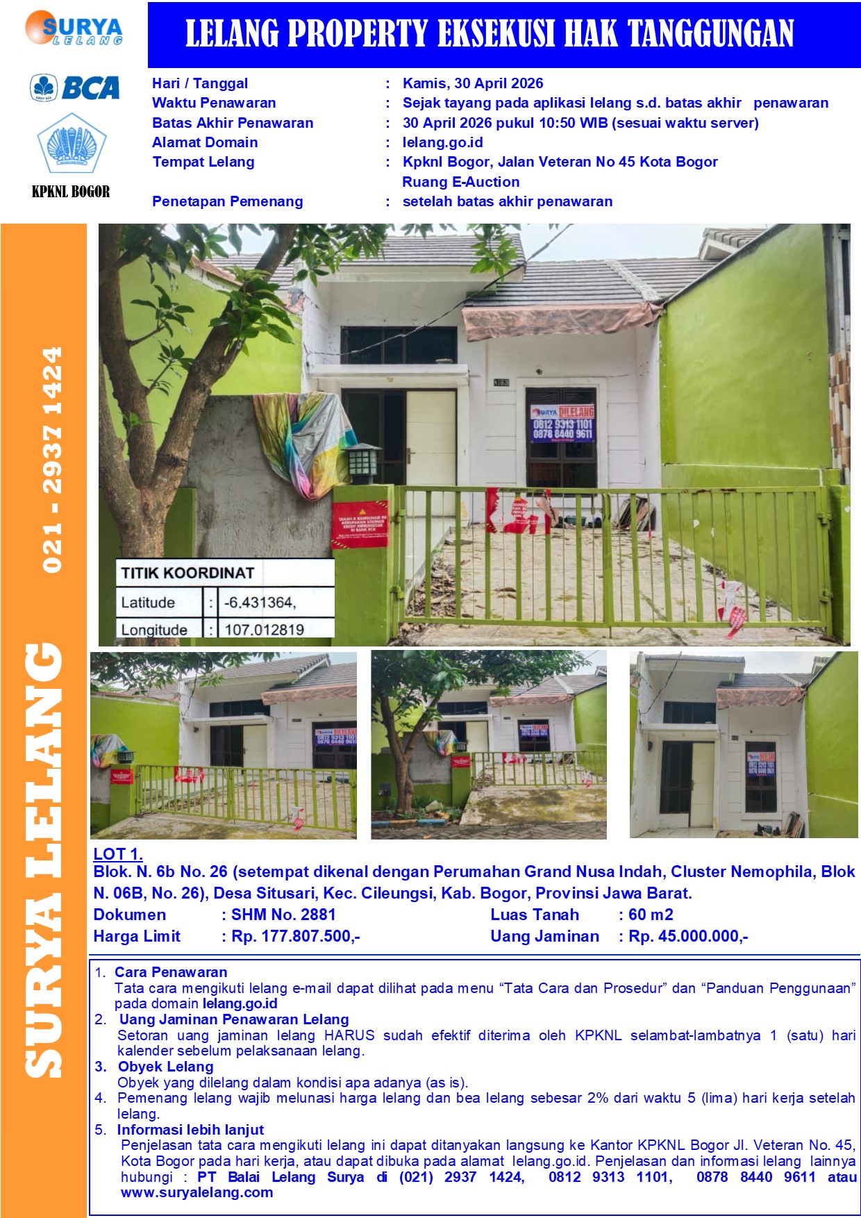 Sebidang tanah seluas 60 m2 berikut bangunan sesuai SHM No. 2881, terletak di Blok. N. 6b No. 26 (setempat dikenal dengan Perumahan Grand Nusa Indah, Cluster Nemophila, Blok N. 06B, No. 26), Desa Situsari, Kec. Cileungsi, Kab. Bogor, Provinsi Jawa Barat