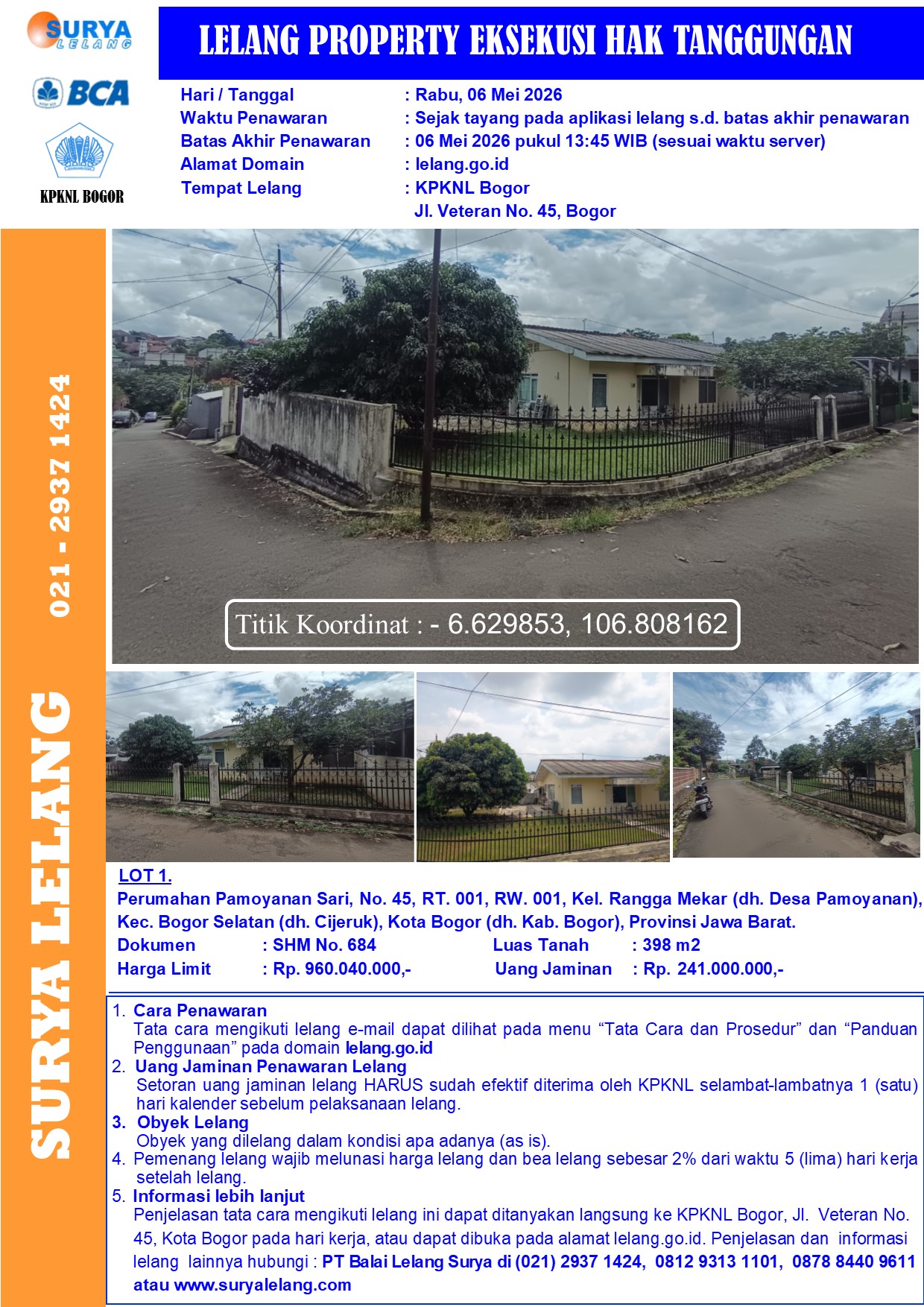 Sebidang tanah seluas 398 m2 berikut bangunan sesuai SHM No. 684=, setempat dikenal dengan Perumahan Pamoyanan Sari, No. 45, RT. 001, RW. 001, Kel. Rangga Mekar (dh. Desa Pamoyanan), Kec. Bogor Selatan (dh. Cijeruk), Kota Bogor (dh. Kab. Bogor), Propinsi Jawa Barat