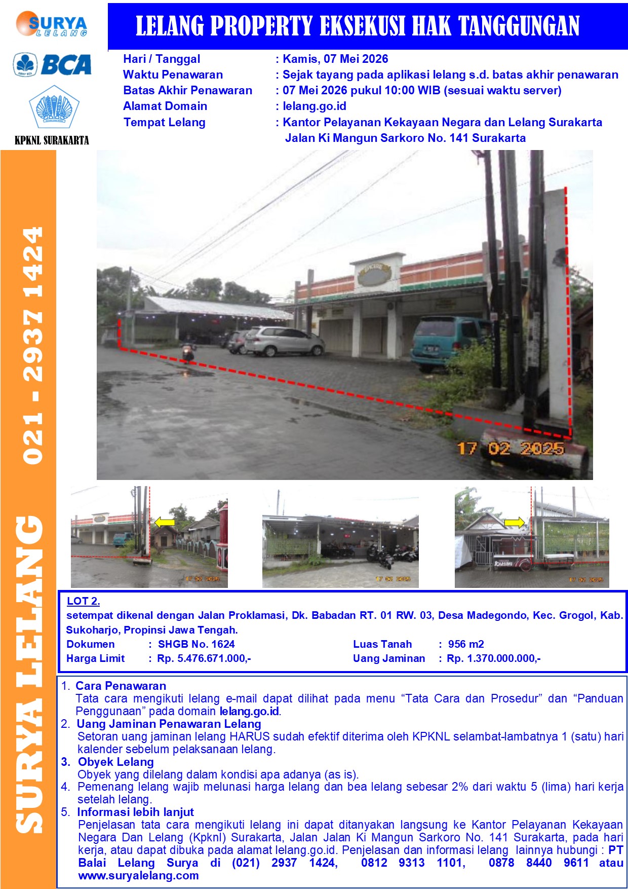Sebidang tanah seluas 956 m2 berikut bangunan sesuai SHGB No. 1624. Berkedudukan di Kab Sukoharjo, setempat dikenal dengan Jalan Proklamasi, Dk. Babadan RT. 01 RW. 03, Desa Madegondo, Kec. Grogol, Kab. Sukoharjo, Propinsi Jawa Tengah